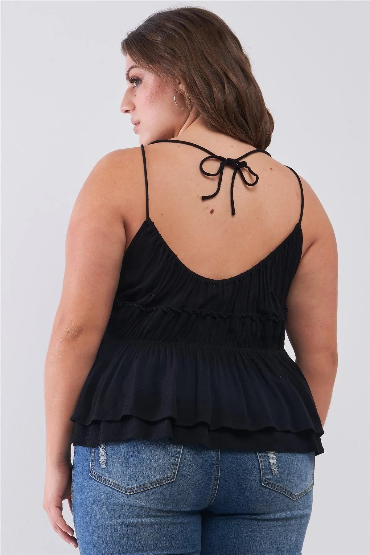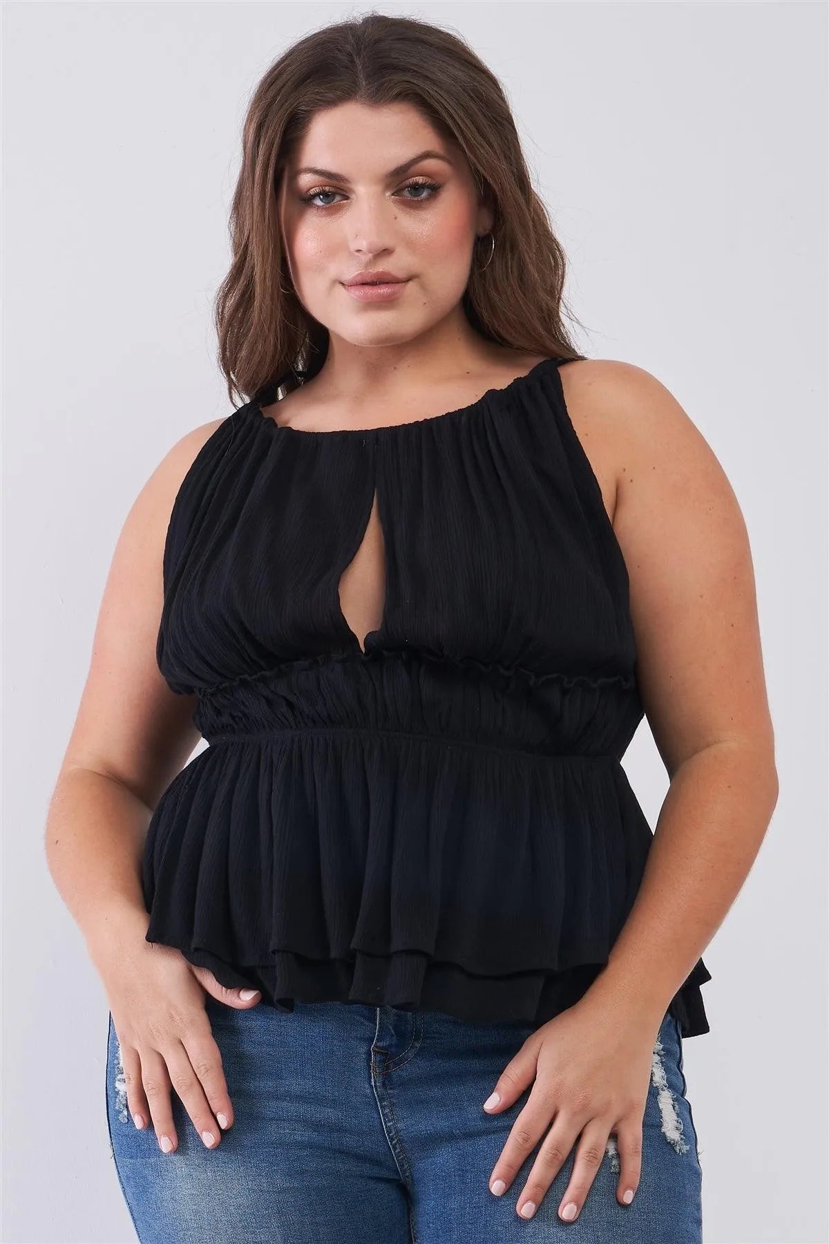 Junior Plus Black Round Neck Sleeveless Front Keyhole Elasticated Waistline Flare Hem Top /1-2-2