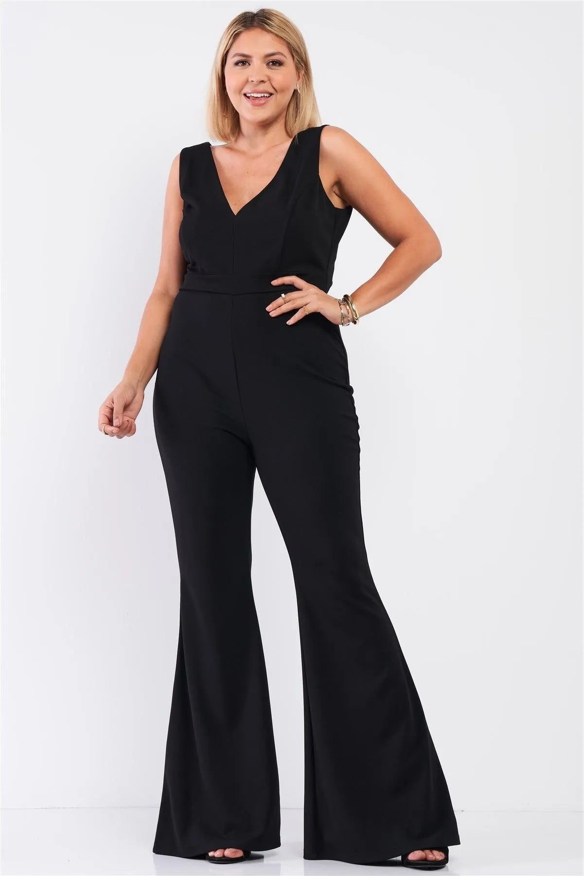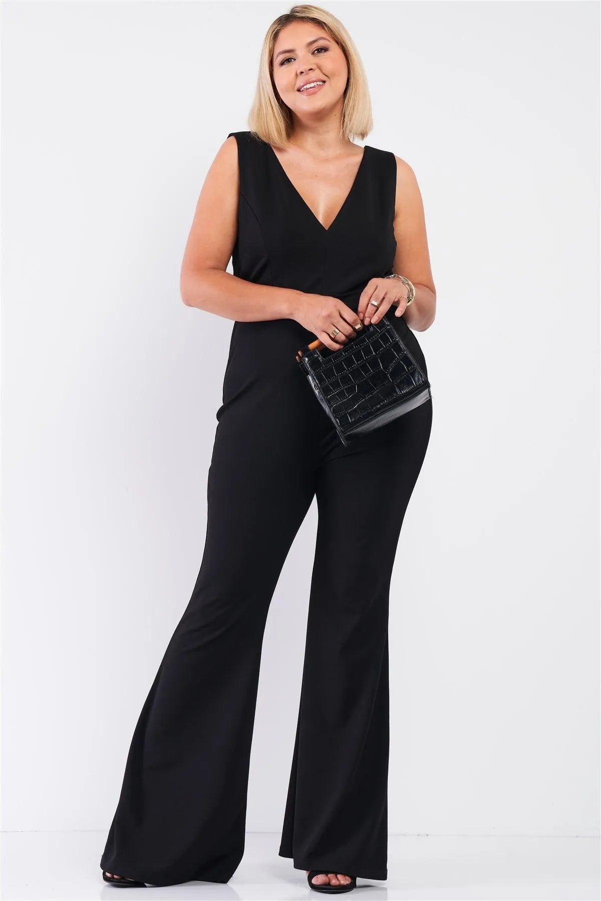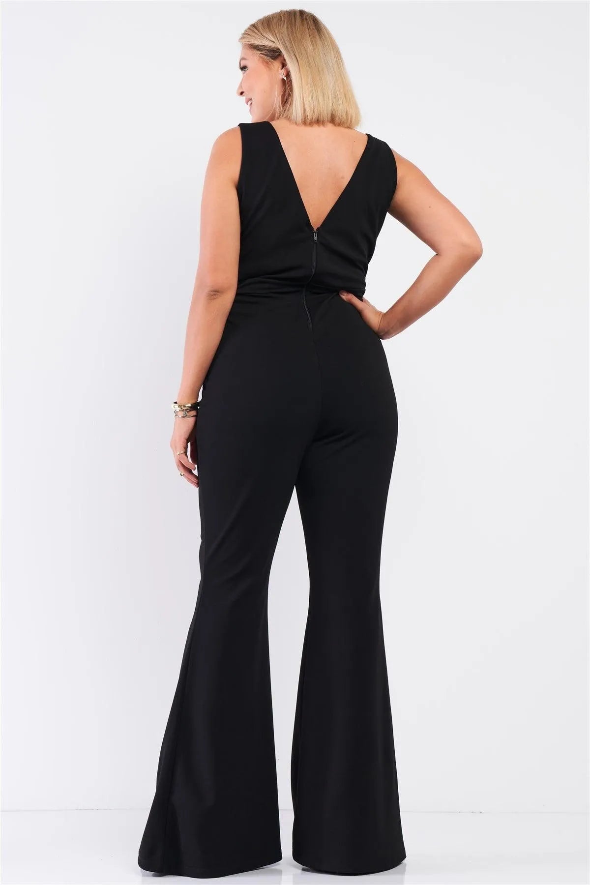 Junior Plus Black Sleeveless Deep Plunge V-Neck Wide Leg Jumpsuit /1-1-1
