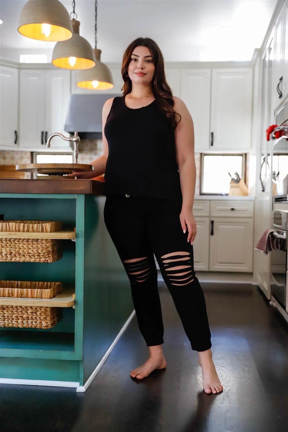 🖤 Item features: Solid black, tank top, crew neckline, relaxed fit, ripped front details, cuffed hem, elasticized waistline with drawstring, two side pockets, stretchy, unlined, comfy, loungewear, stylish, trendy, must have