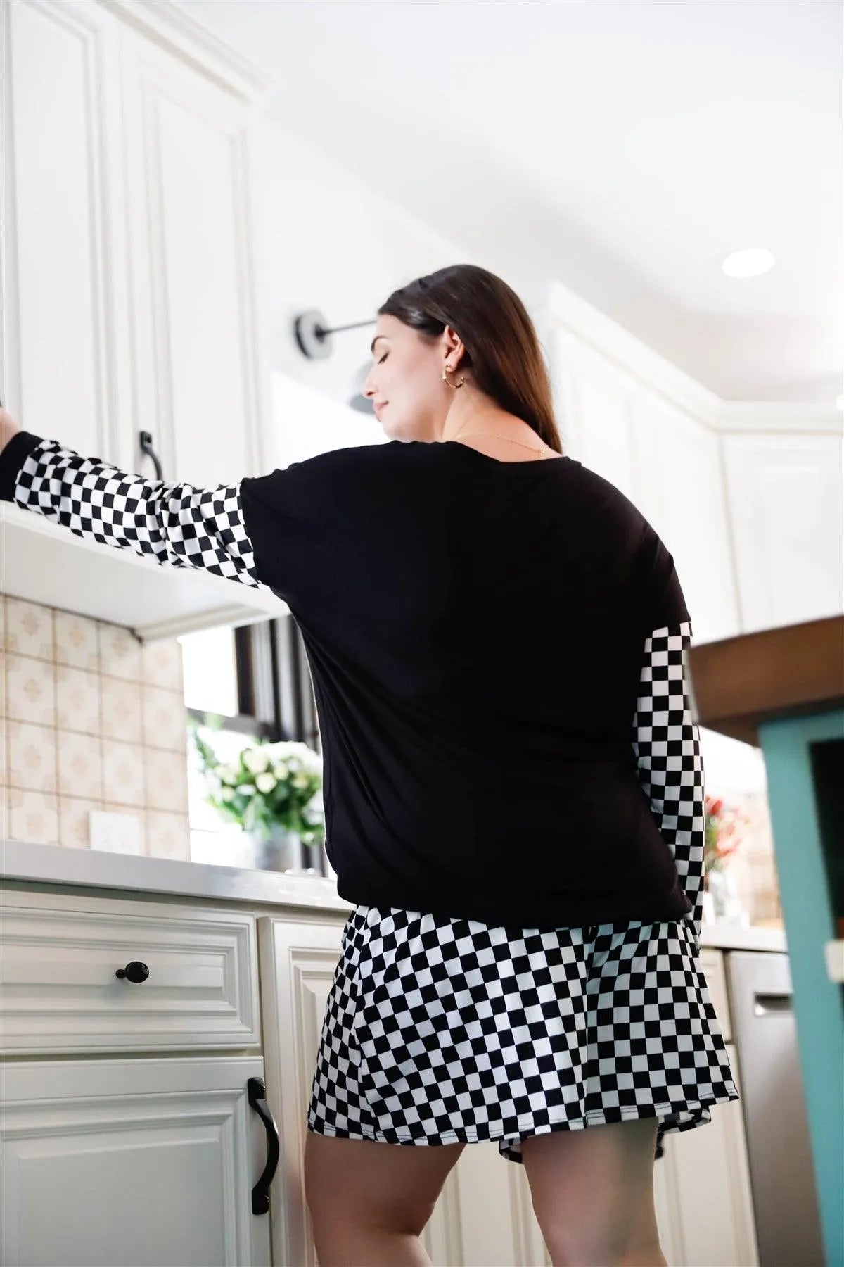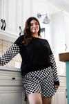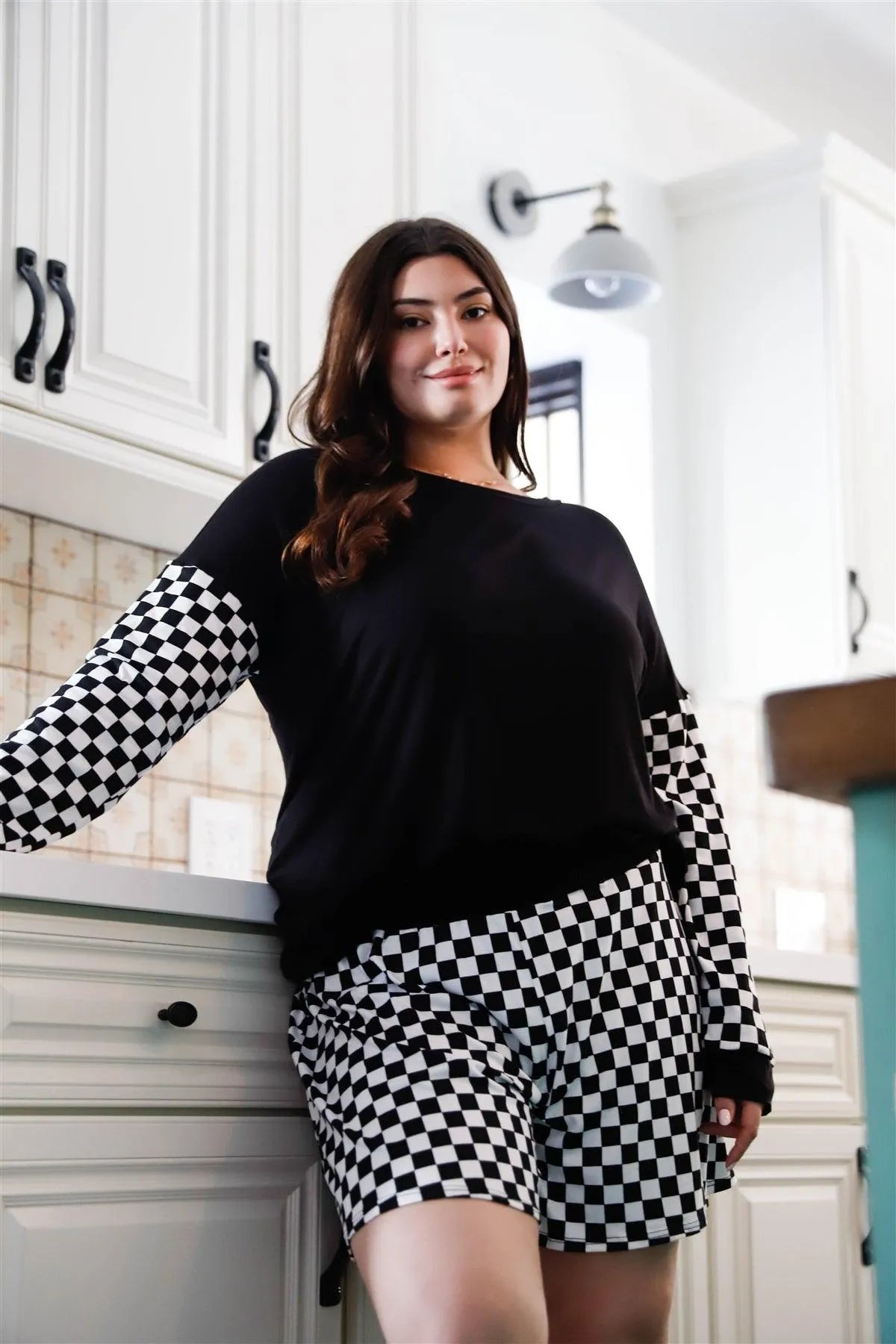 Junior Plus Black & White Checkered Pattern Long Sleeve Top & Shorts Set /1-1-1