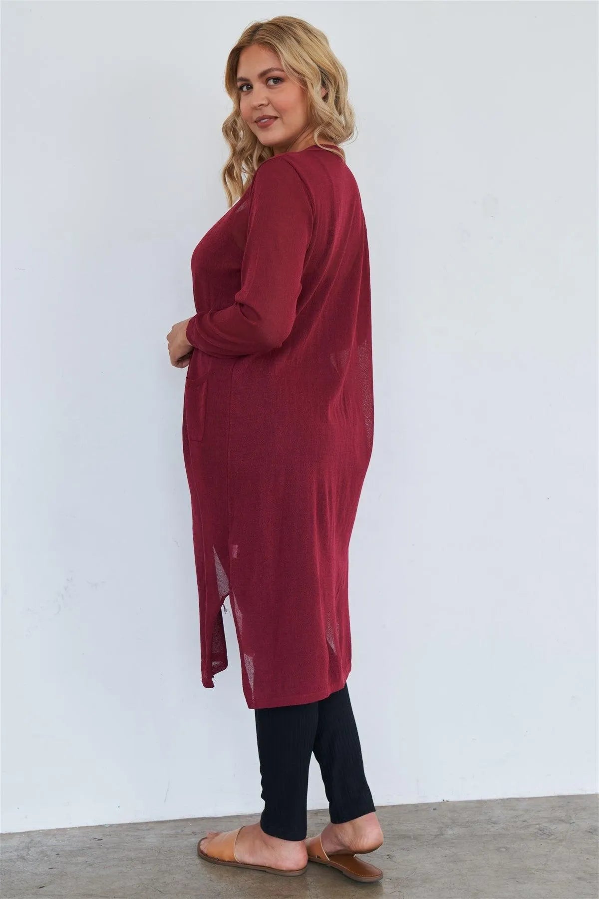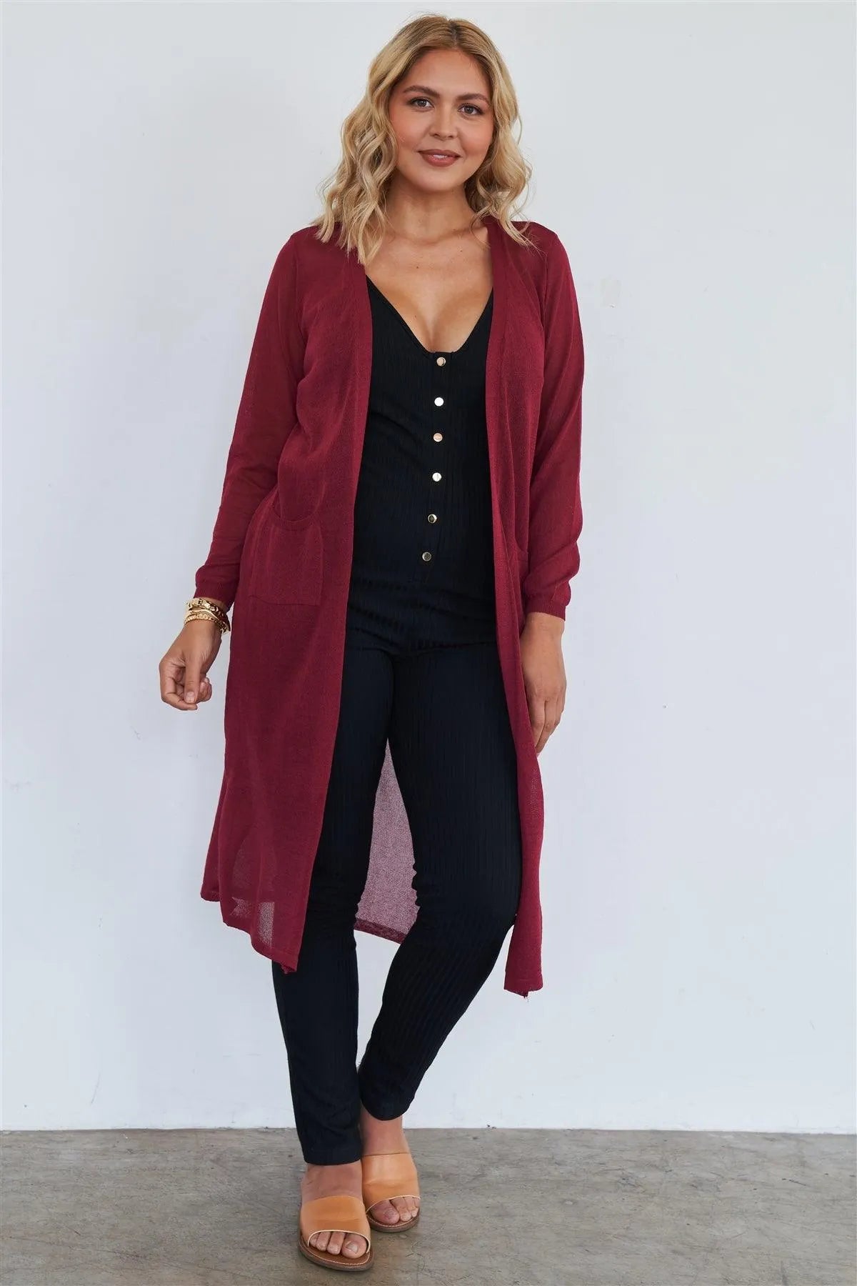 🖤 Junior Plus Size cardigan features: Solid, burgundy, floor length, double pockets, long sleeve, unlined, light weight, stretchy