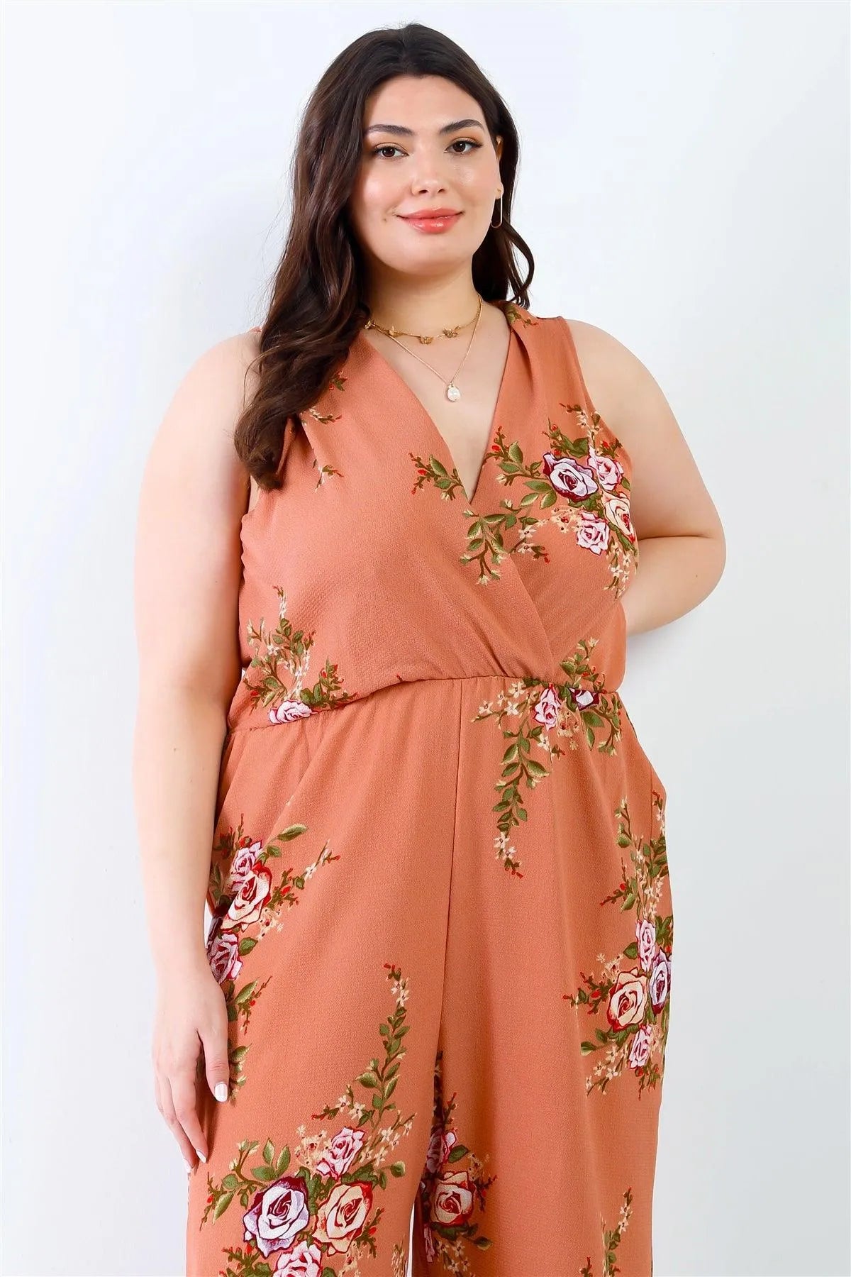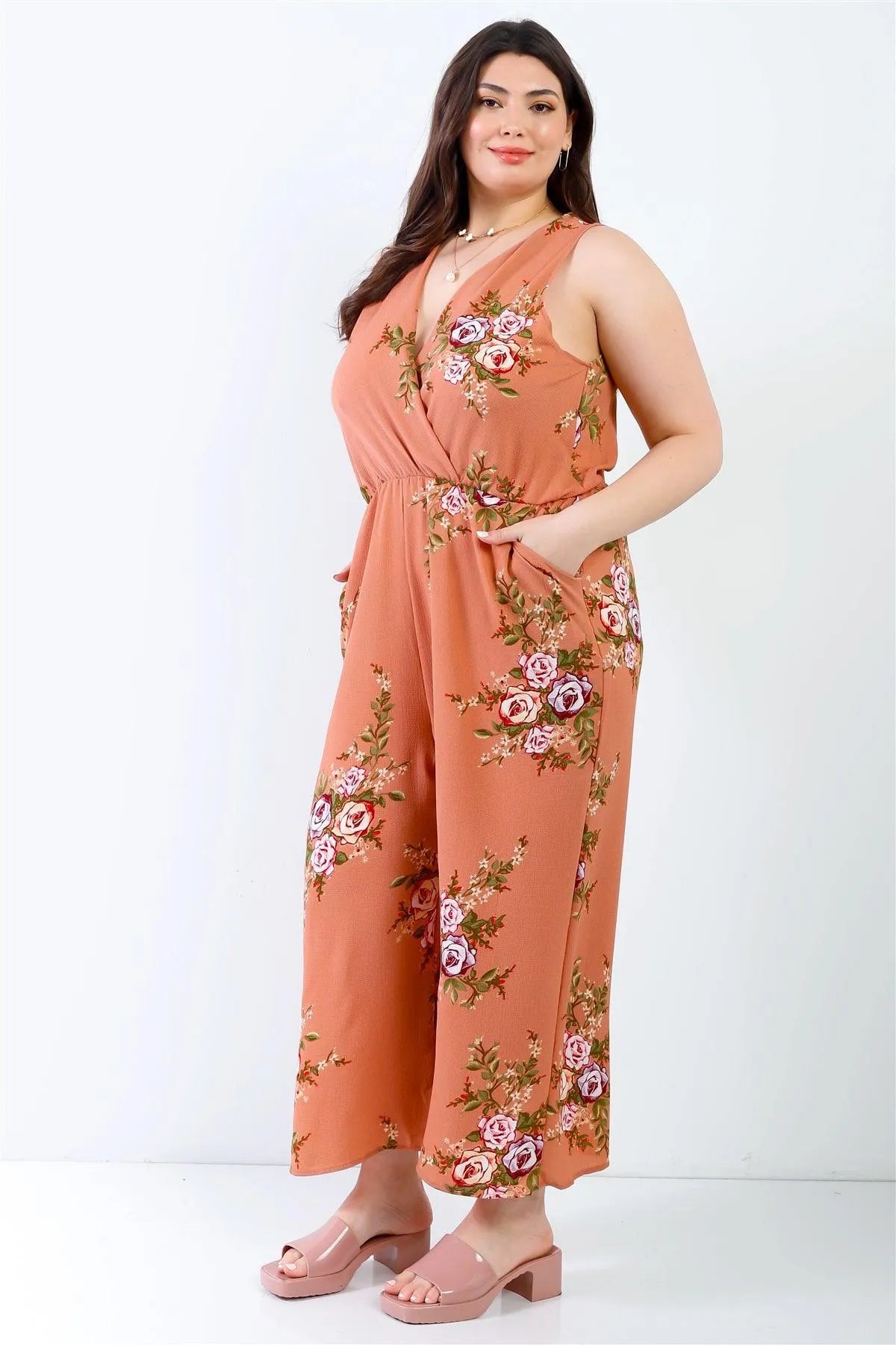 Junior Plus Caramel Flower Print Wrap V-Neck Back Self-Tie Detail Sleeveless Jumpsuit /2-4