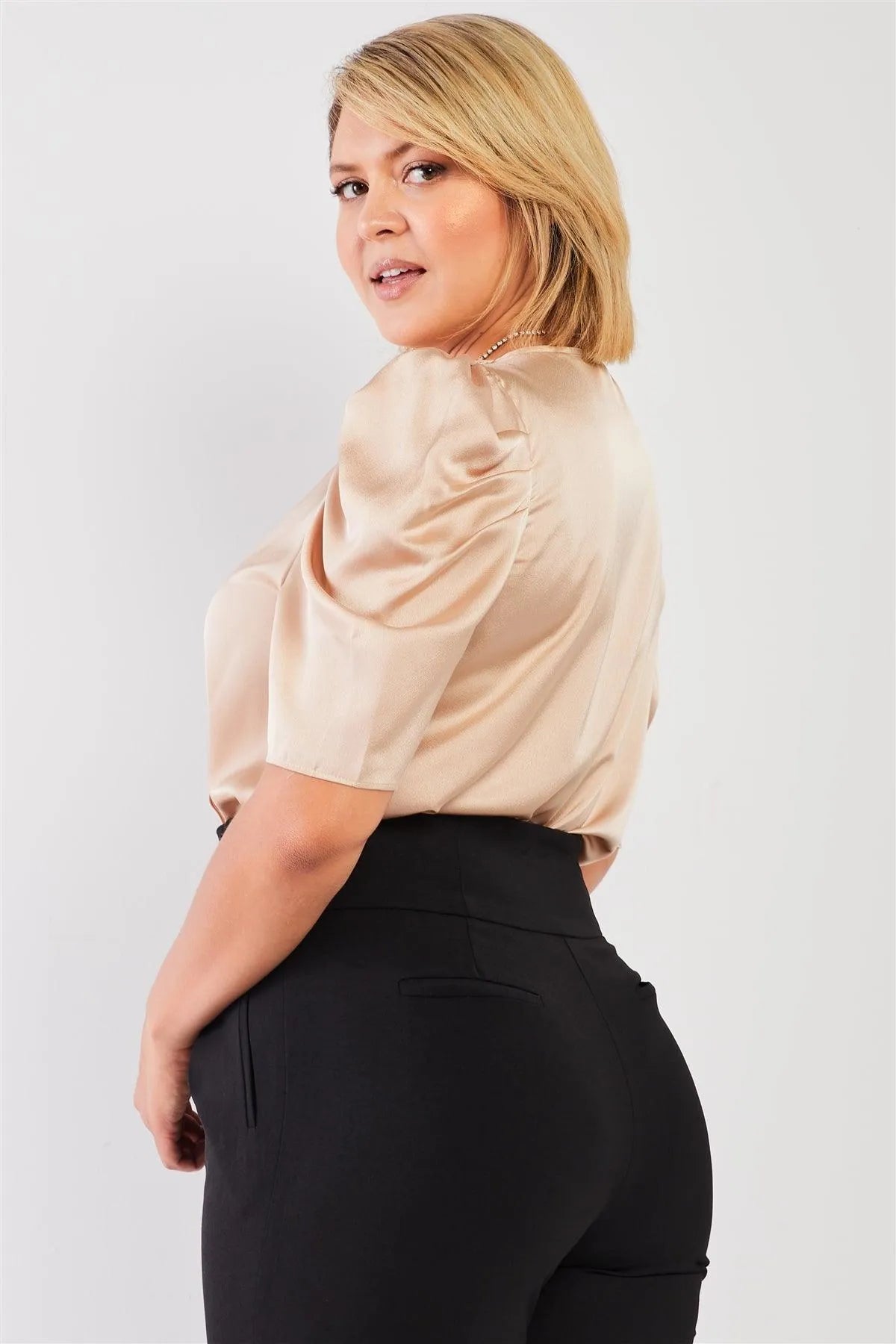 🖤 Item Features: Champagne, solid color, satin, plunging v-neckline with snap button closure, lantern short sleeve, stretchy contrast button with double snap closure, holiday look, clubwear, sexy, elegant