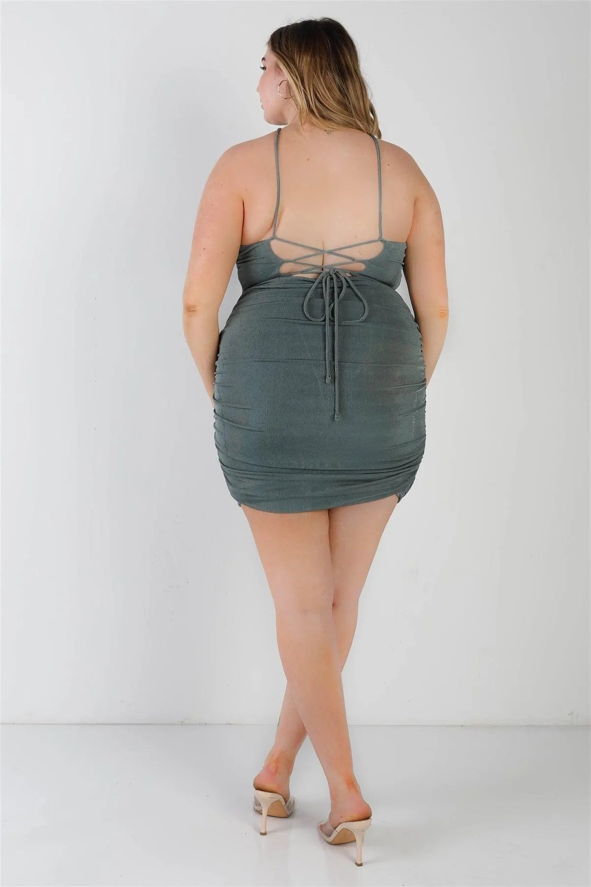 🖤 Get ready to turn heads in this hot and sexy Plus Size Sage Ruched Back Lace Down Mini Dress! The dusty sage color and textured material will make you stand out, while the halter neckline and side ruched details flatter your figure. With a back lace down closure and mini length, this dress is perfect for any club wear occasion. It's a must-have addition to your stylish and trendy wardrobe.