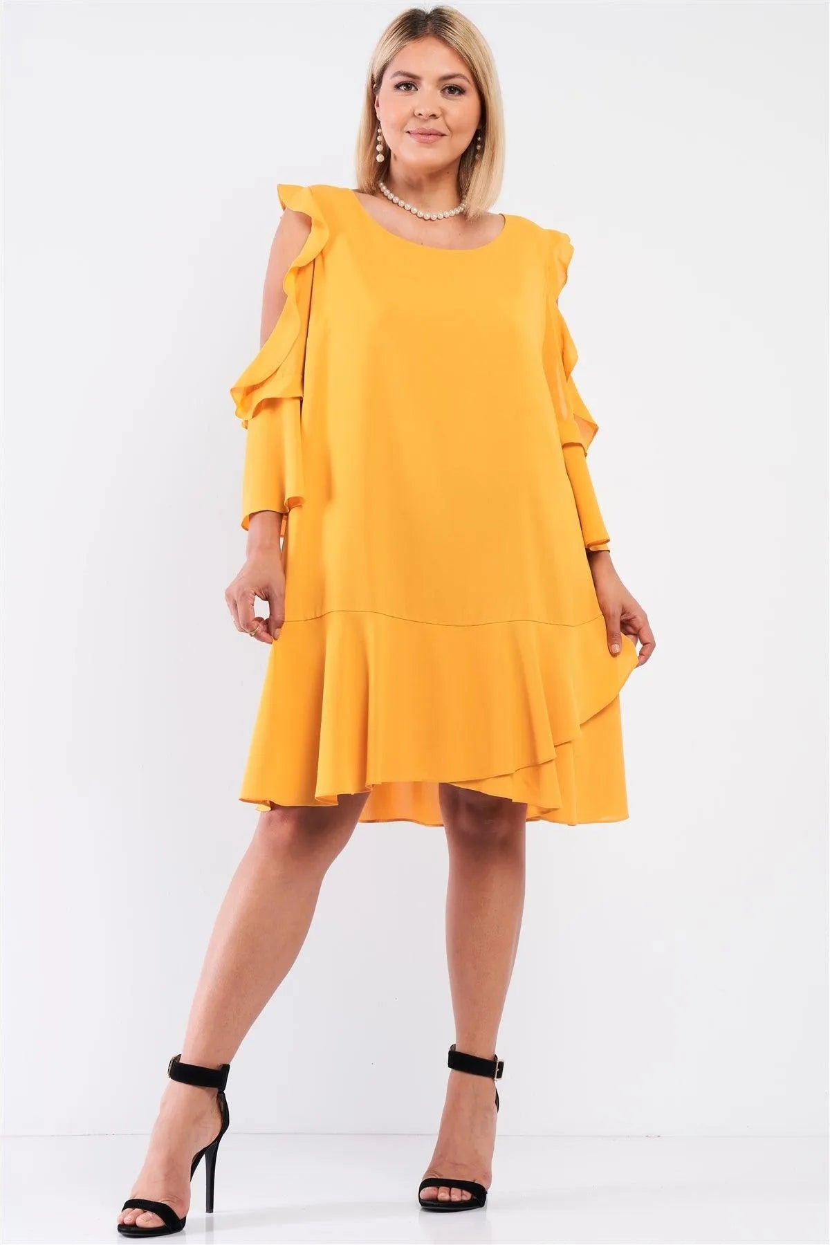 Junior Plus Mustard Midi Sleeve Flare Hem Layered Bottom Off-The-Shoulder Mini Dress /1-1-1