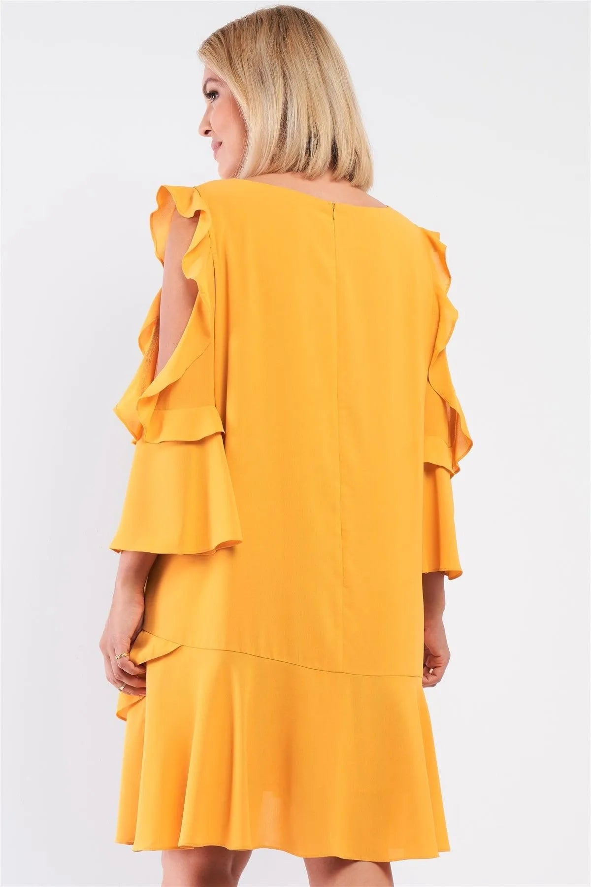 🖤 Item features: Mustard, solid, off-the-shoulder, midi angel sleeve, flare hem, round neckline, asymmetrical layered bottom, relaxed fit, lined, non-stretch, back hidden zipper and hook&eye closure, mini length, cute, casual, simplistic design, girly, stylish, fall/winter collection