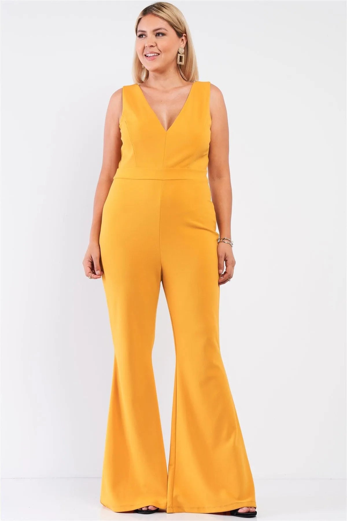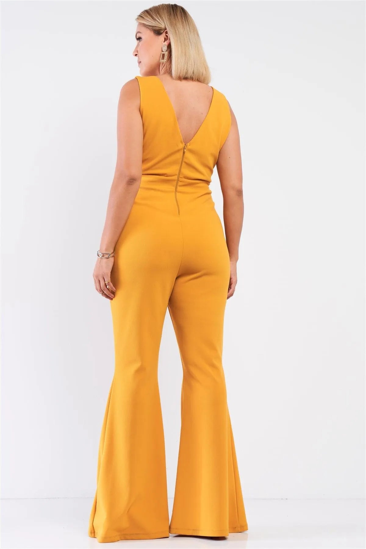 Junior Plus Mustard Sleeveless Deep Plunge V-Neck Wide Leg Jumpsuit /1-2