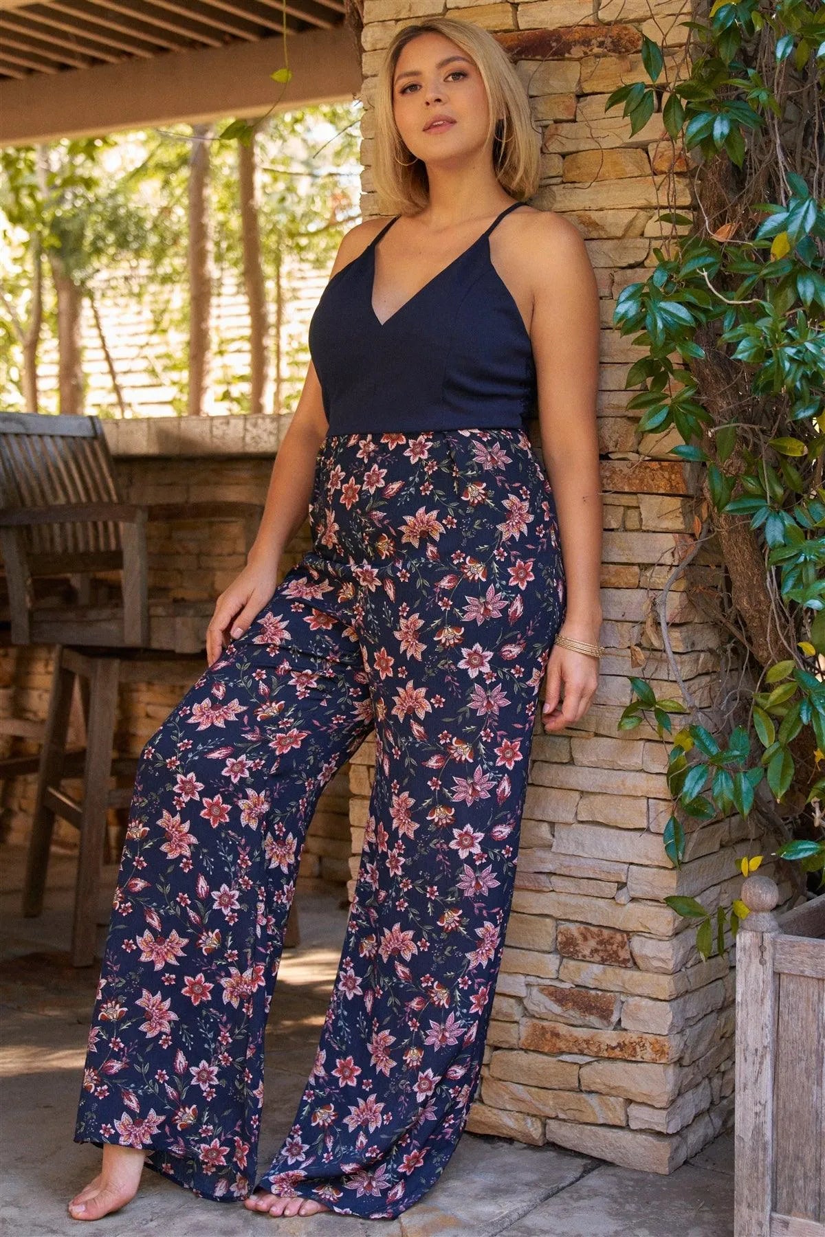 Junior Plus Navy Floral Print Sleeveless V-Neck Lace Back With Zip Wide Leg Jumpsuit /2-2-2