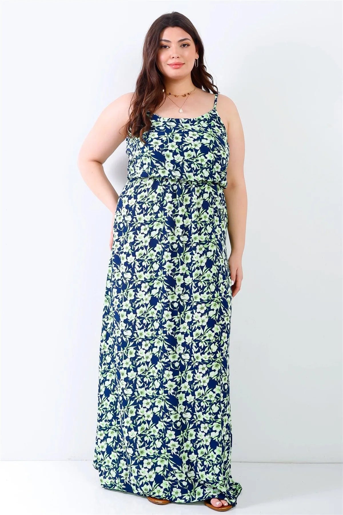 Junior Plus Navy & Green Floral Print Textured Sleeveless Maxi Dress /2-2-2