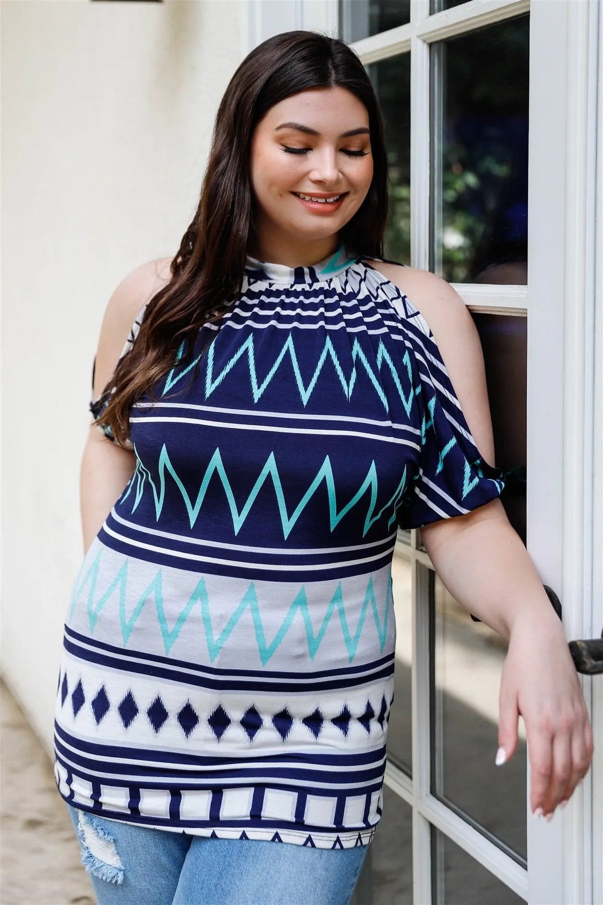 Junior Plus Navy & Mint Geometric Print Cold Shoulder Short Sleeve Back Self-Tie Top /2-2-2