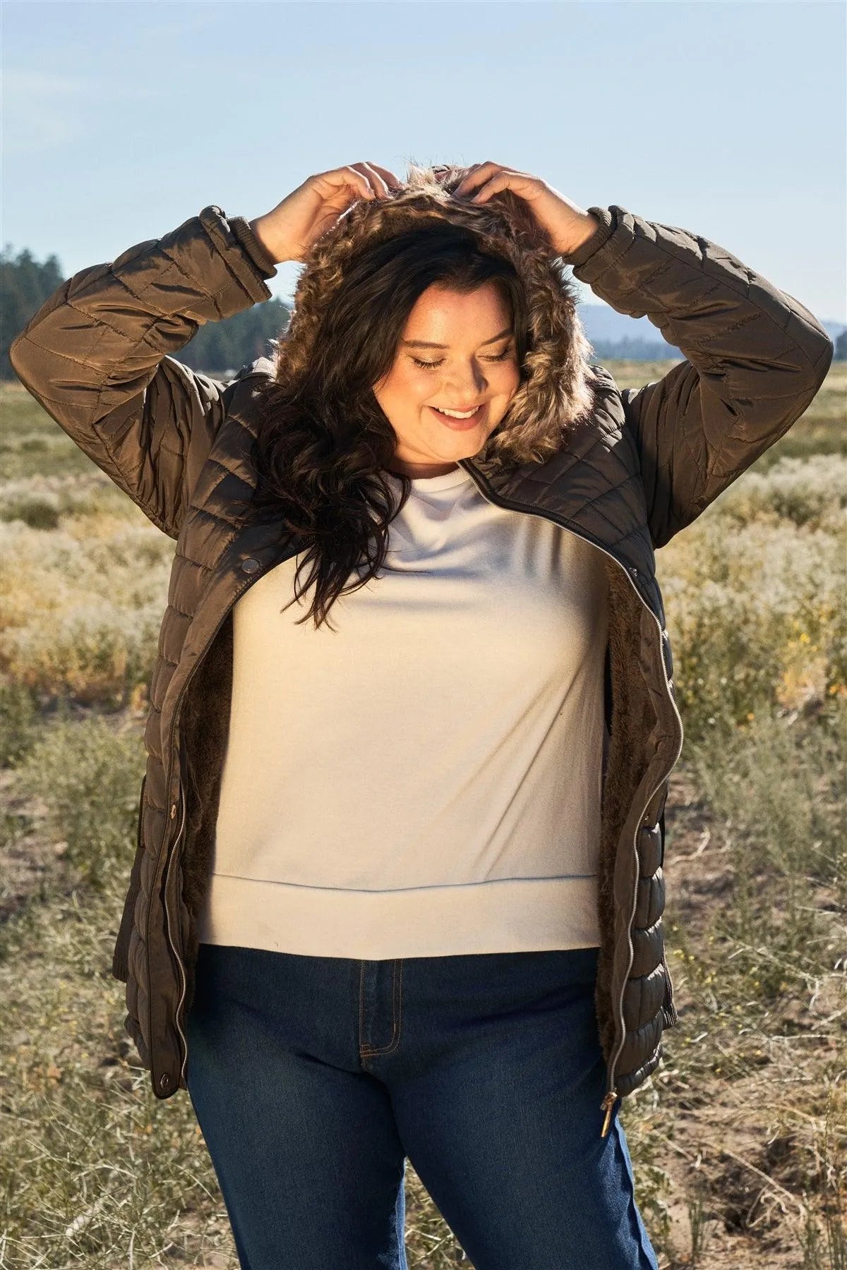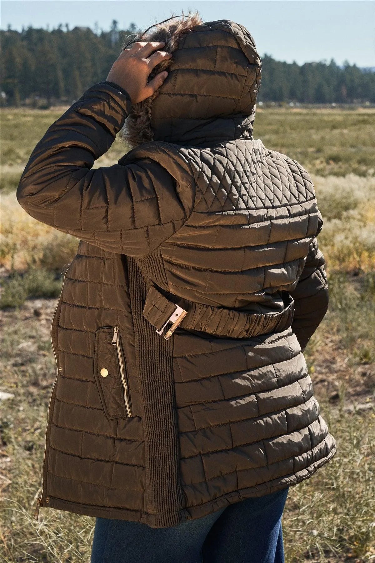 Junior Plus Olive Grey Diamond Quilt Faux Fur Hood Belted Padded Long Puffer Jacket