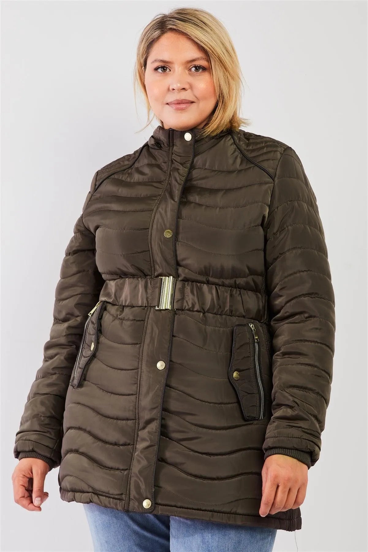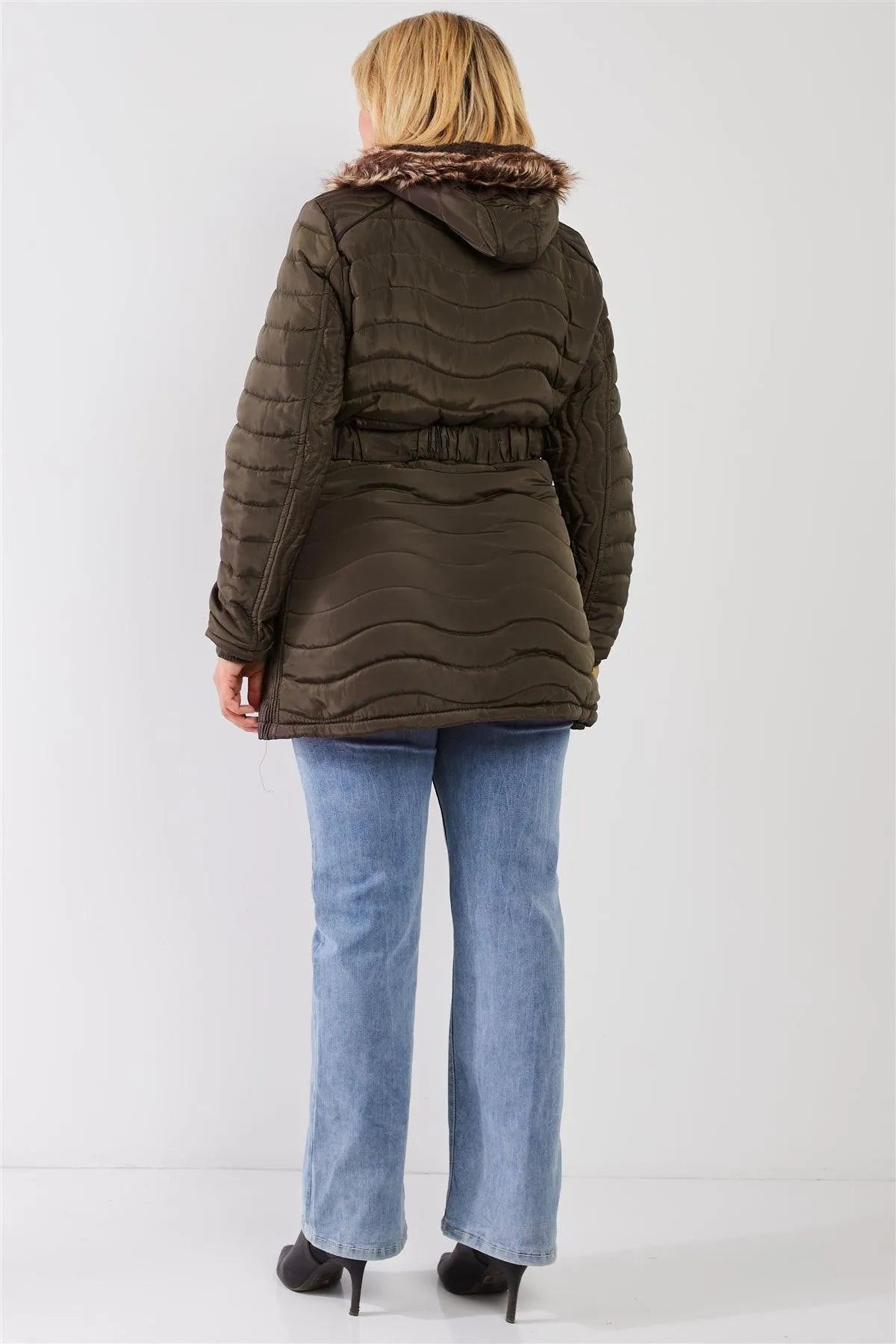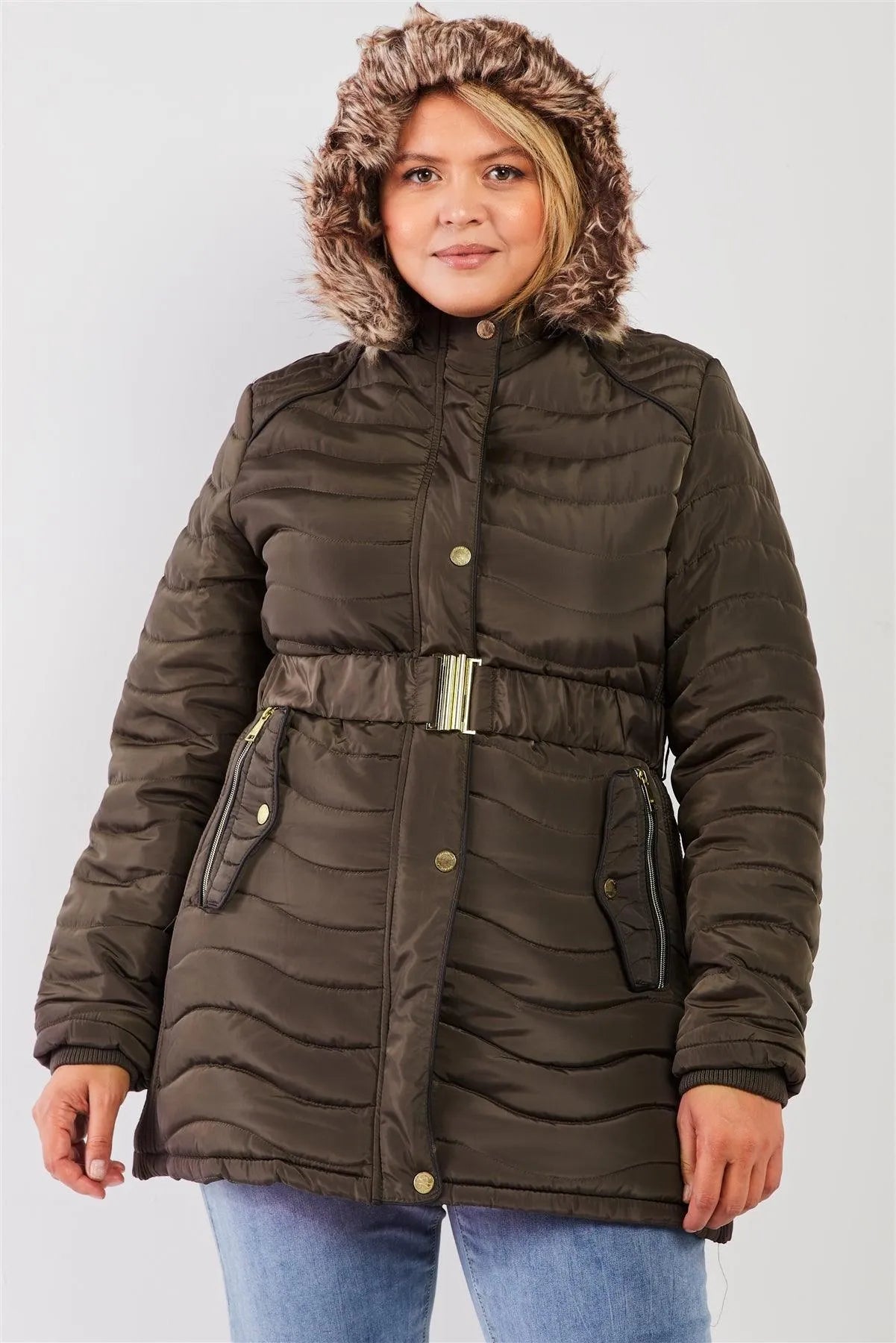 Junior Plus Olive Wavy Quilt Padded Faux Fur Detachable Hood Belted Long Puffer Jacket