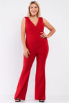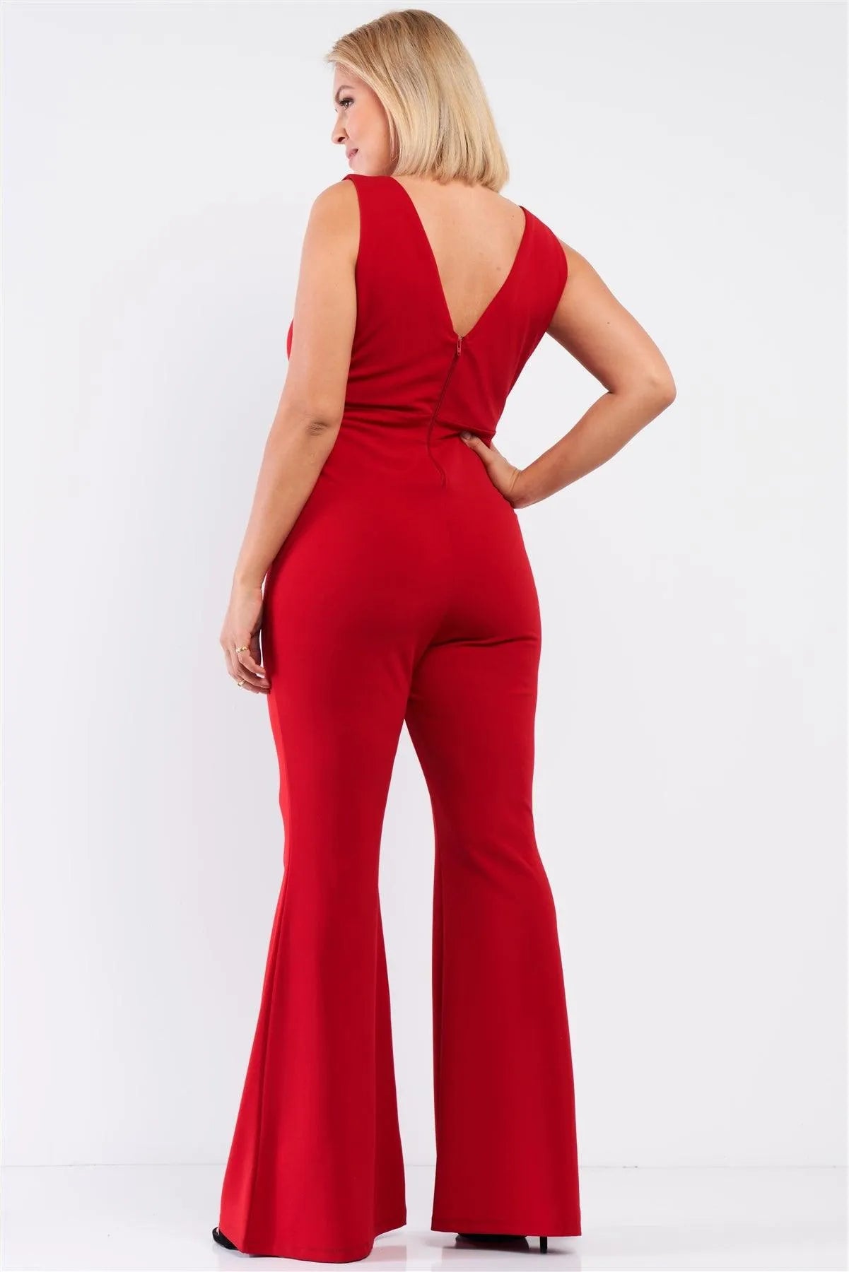 Junior Plus Red Sleeveless Deep Plunge V-Neck Wide Leg Jumpsuit /1-1-1