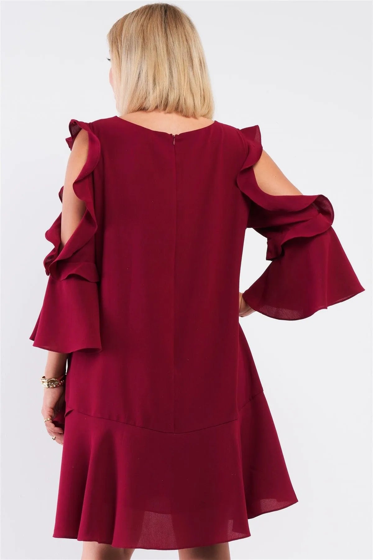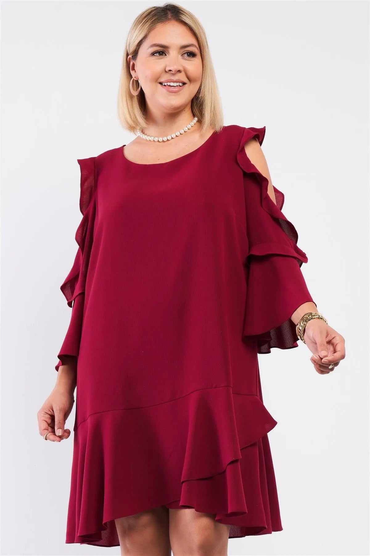 Junior Plus Rose-Wood Midi Sleeve Flare Hem Layered Bottom Off-The-Shoulder Mini Dress /1-1-1