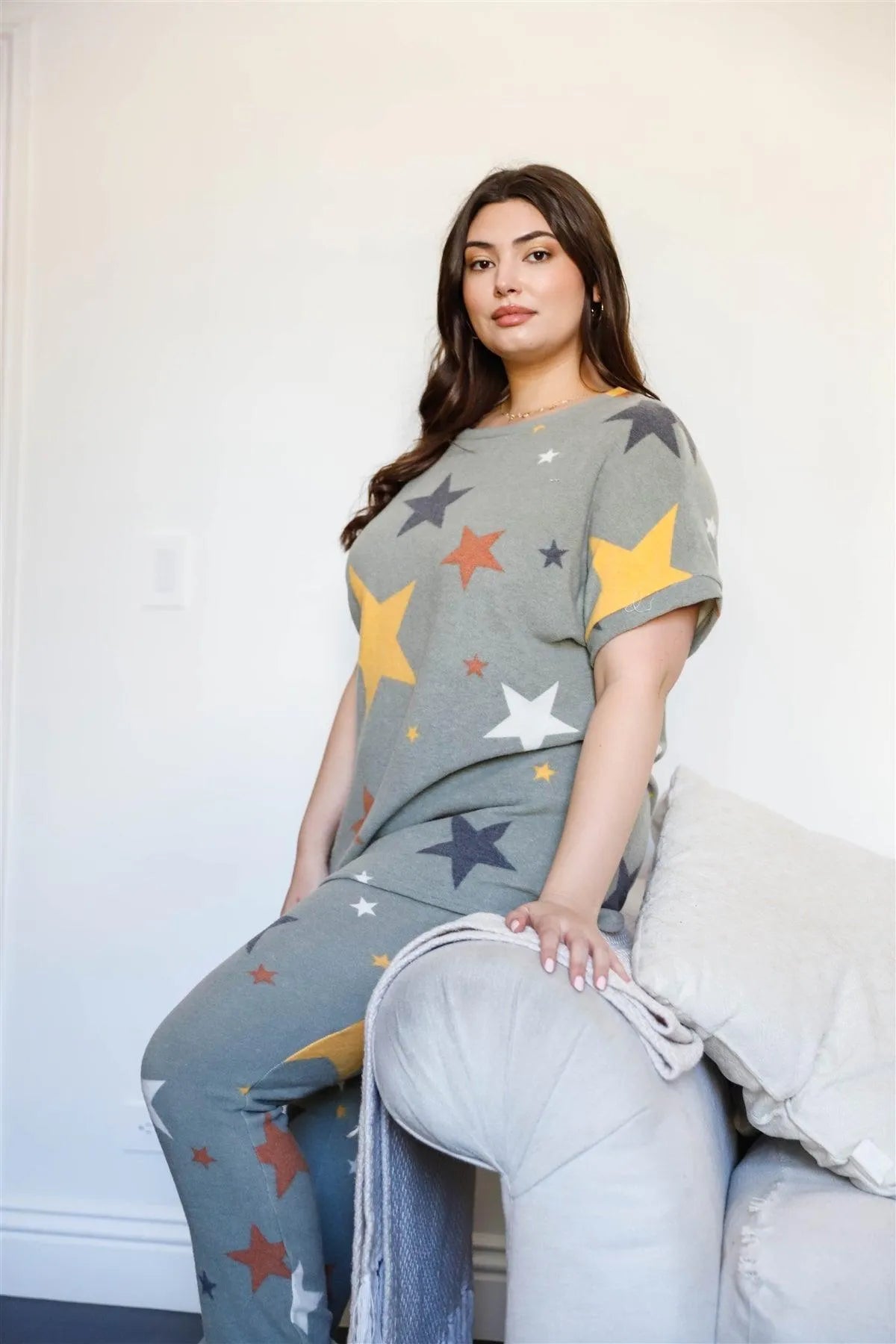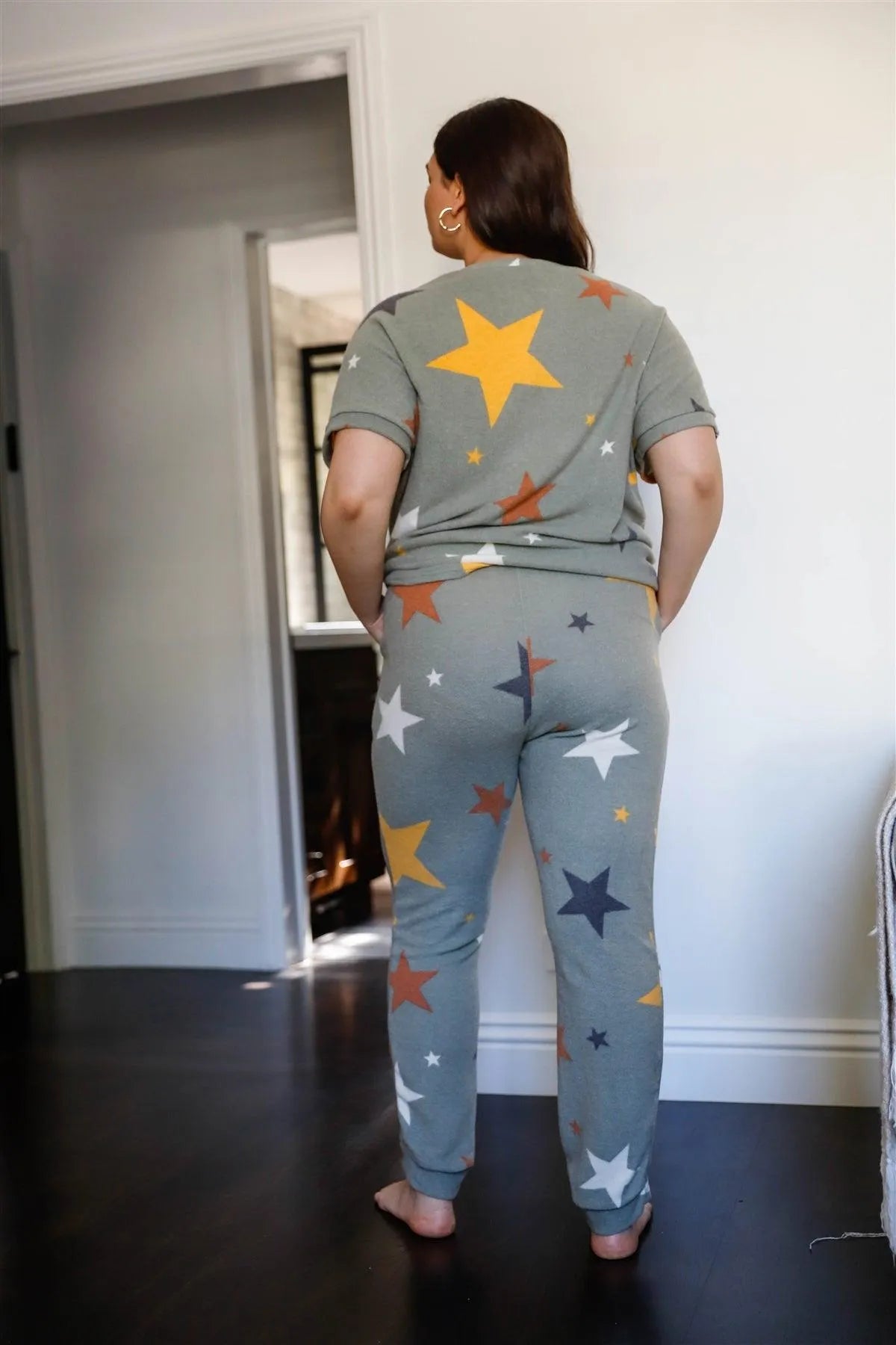 Junior Plus Sage Star Print Flannel Loose T-Shirt & Sweatpants Set /1-1-1