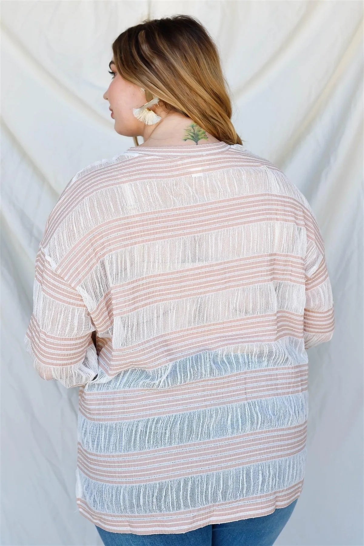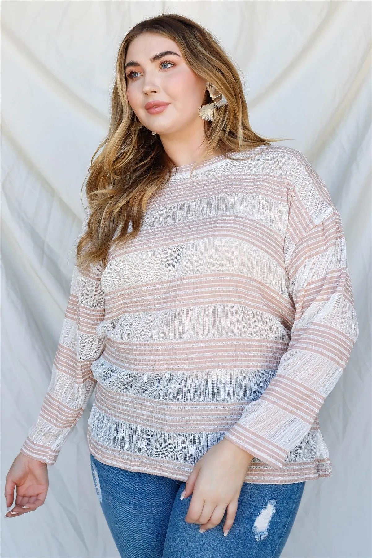 Junior Plus Tan Crochet Stripe Long Sleeve Semi-Sheer Top /3-2-1