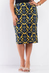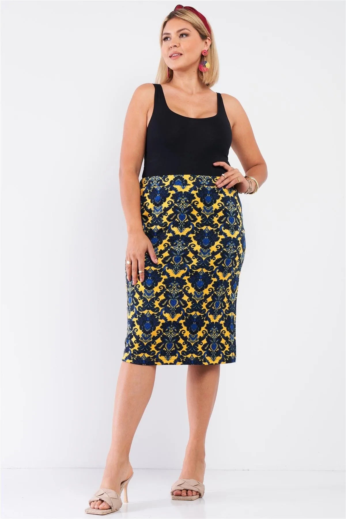Junior Plus Yellow Blue And Black Damask Print High Waisted Mini Pencil Skirt /3-1-2