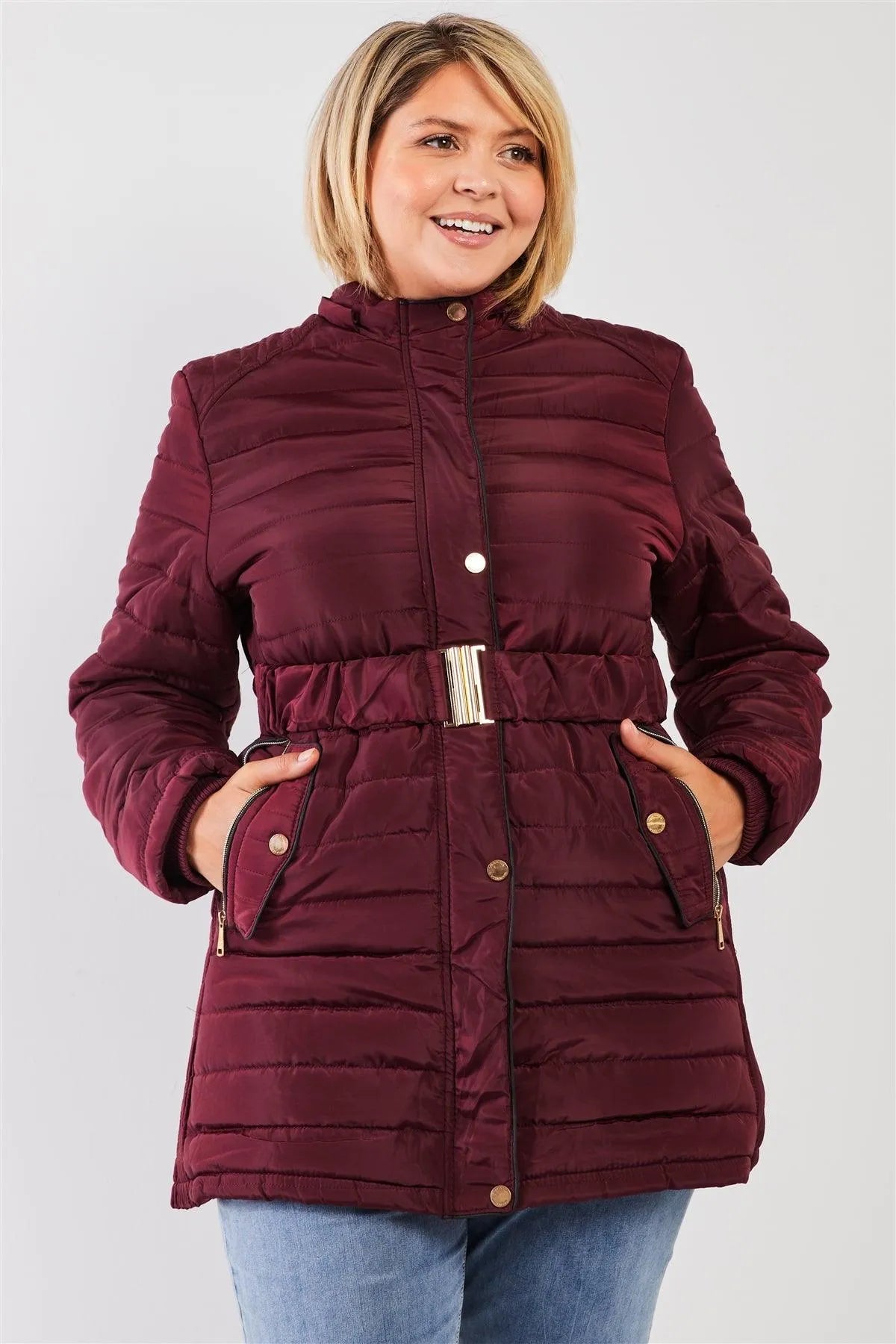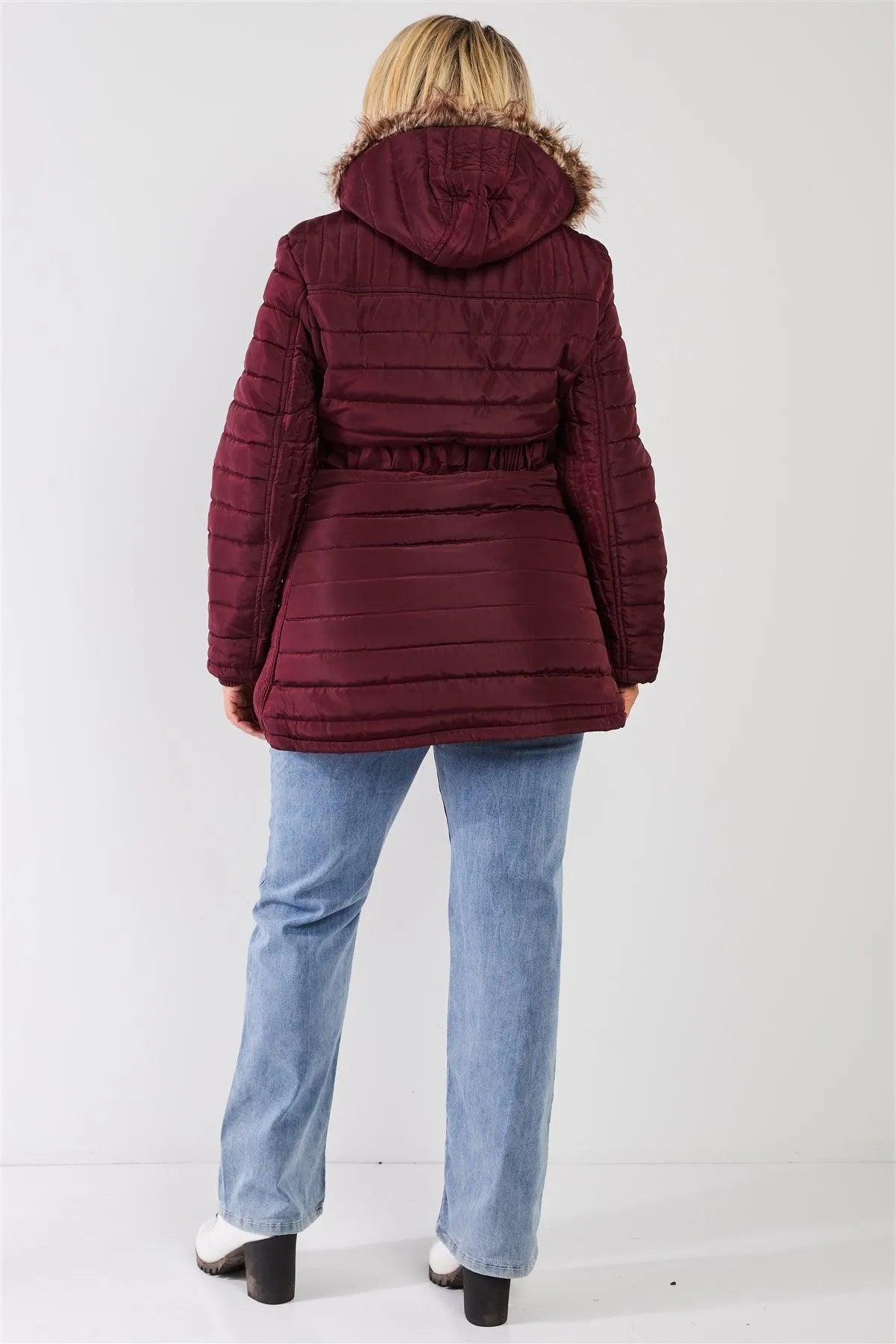 Junior Plus Wine Parallel Quilt Faux Fur Hood Belted Padded Long Puffer Jacket