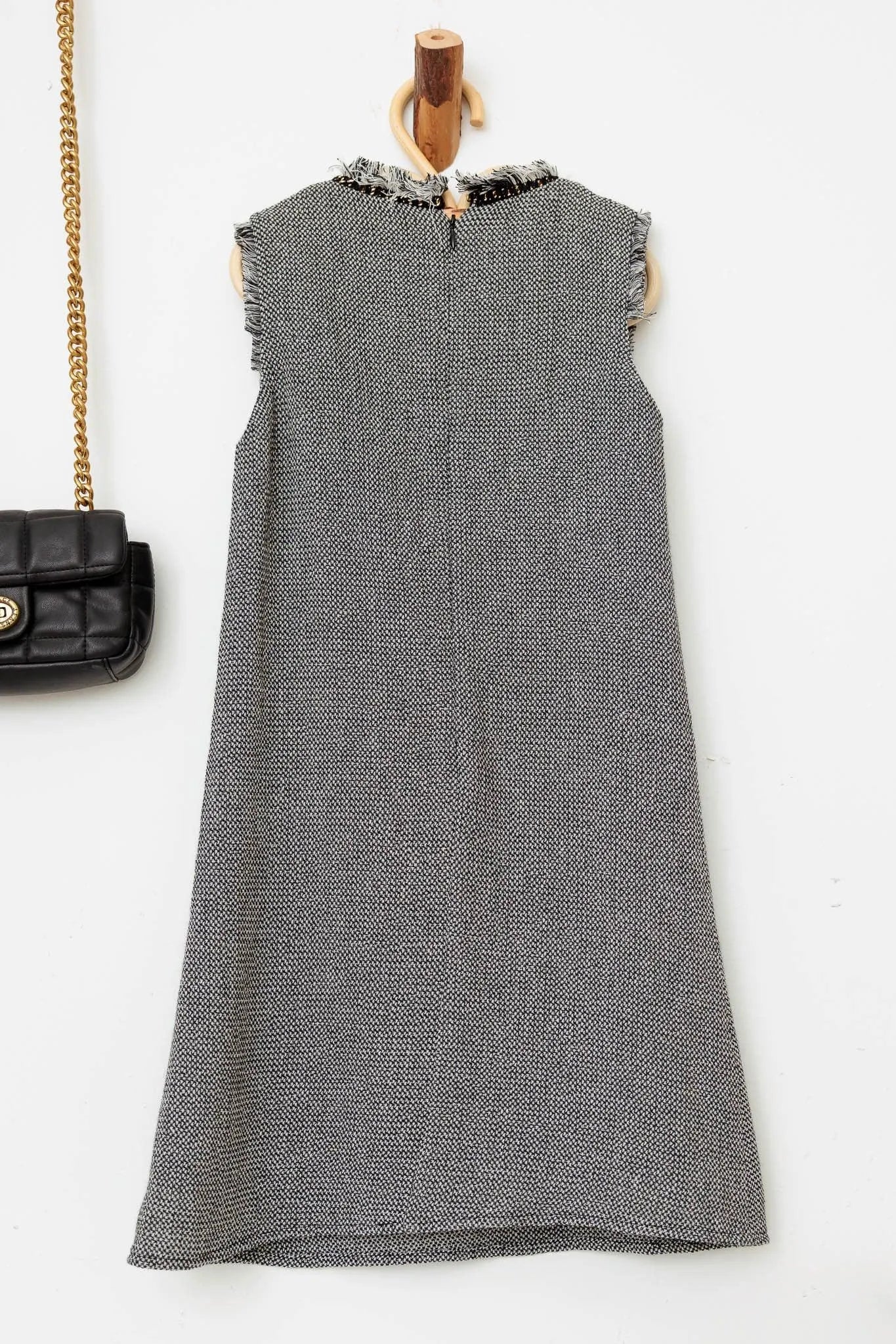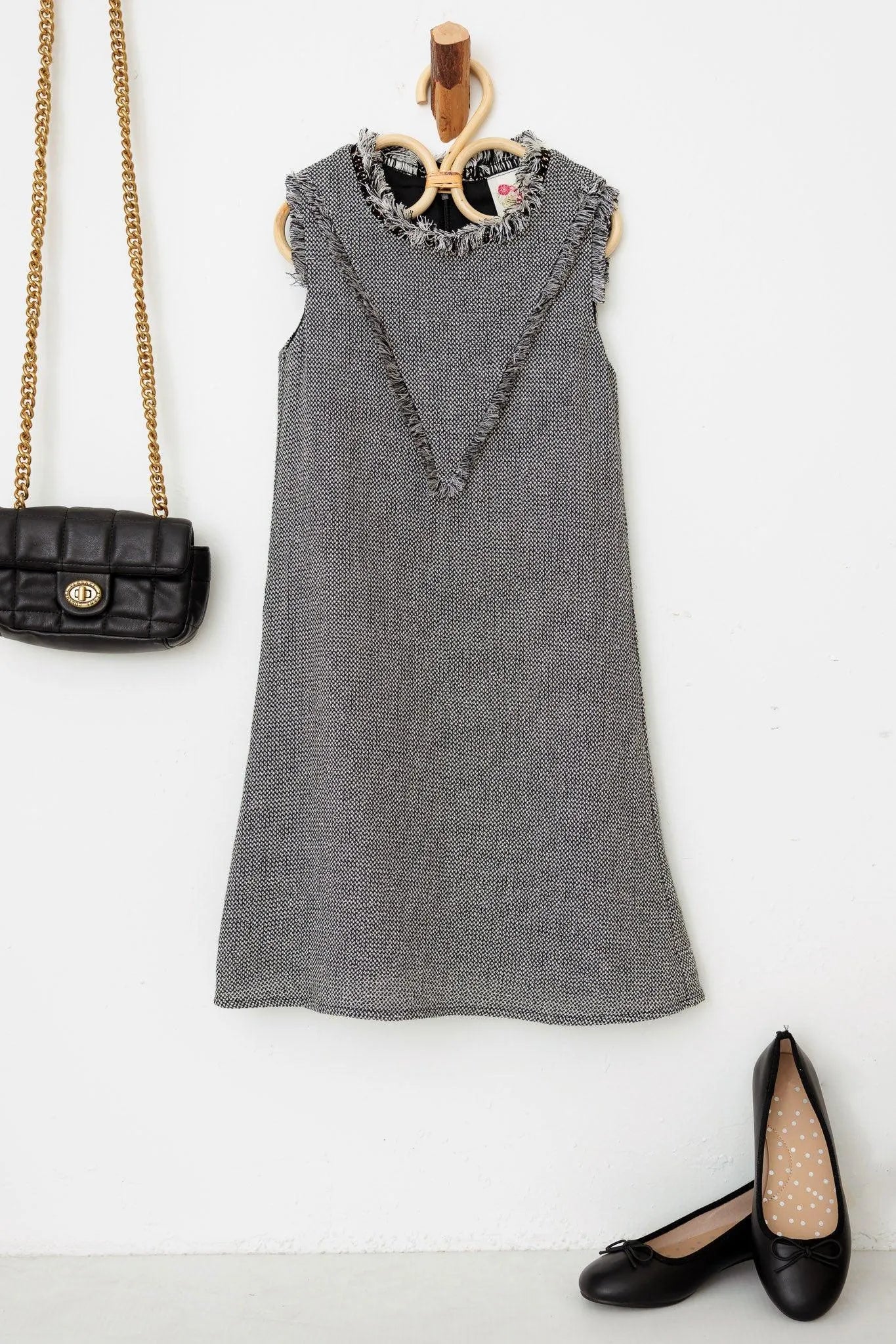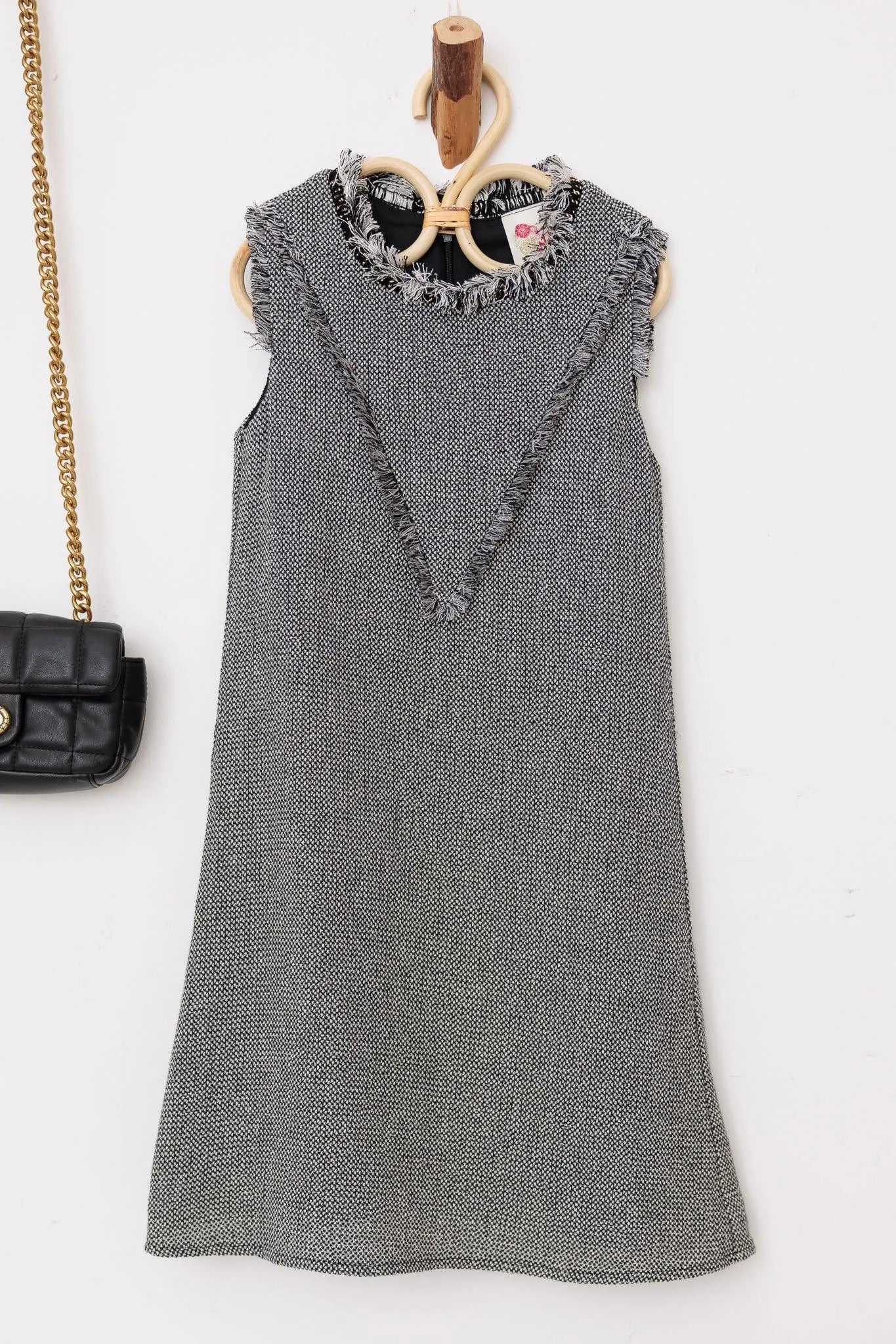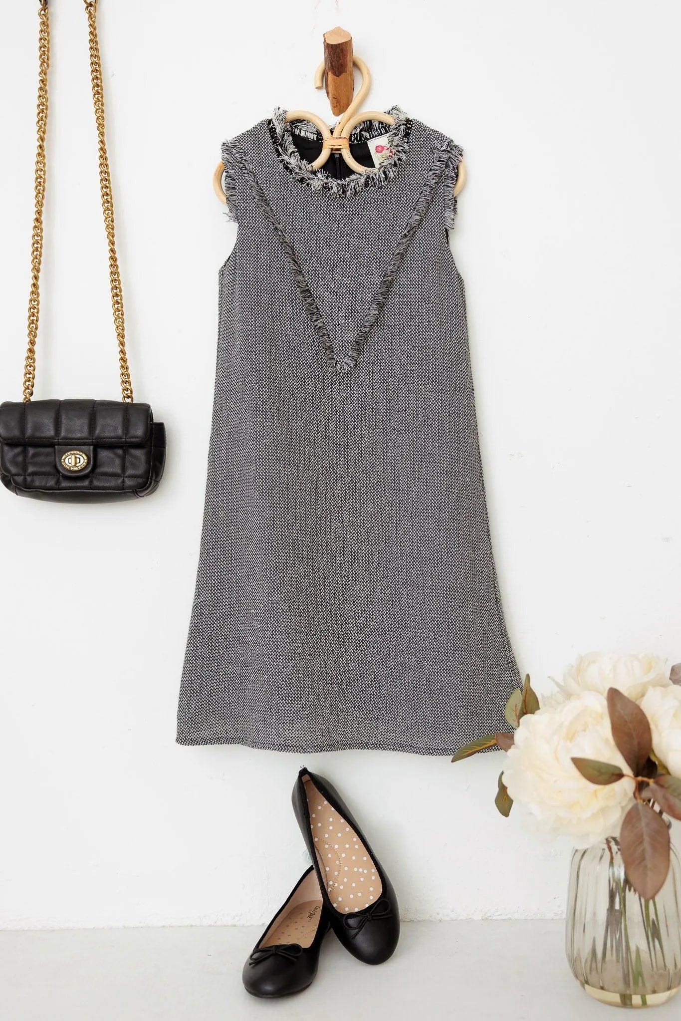Girls Sleeveless Tweed Chain Neck-Line Fringe Dresses