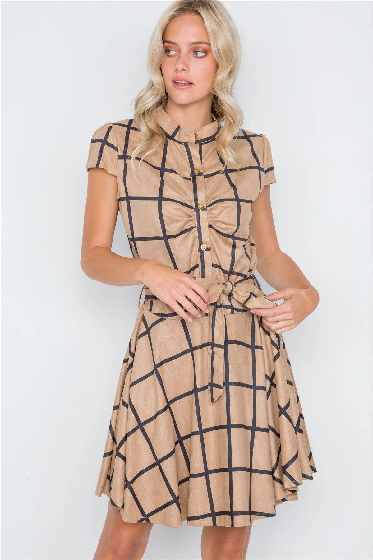 Dress features: cap sleeves, check pattern allover, front button closure, A-Line silhouette, self tie waist belt, mini length, unlinedModel is 5'9 wearing a size Small ( Waist: 24", Bust: 32A, Hips: 34")Small Size Item Measurements: Length: 36.5", Bust: 36" Sleeves: 4.5"True to size