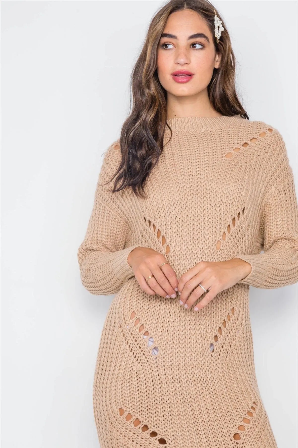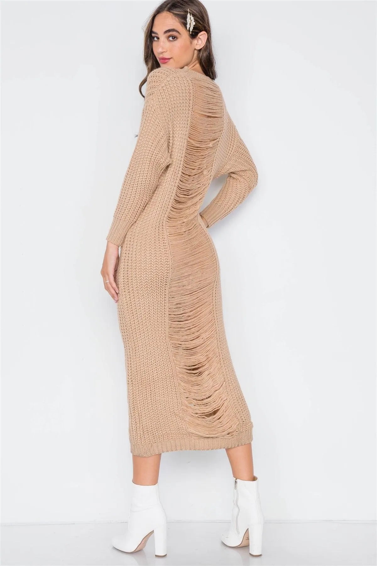 Sweater Dress features: long sleeves, round neck, distressed detailing at back, chunky knit, dropped shoulders, midi length, slightly sheerModel is 5'9 wearing a size Small (Waist: 24", Bust: 32A, Hips: 34")Size Small Item Measurements: Length: 52", Bust: 36", Sleeves: 38"True to size