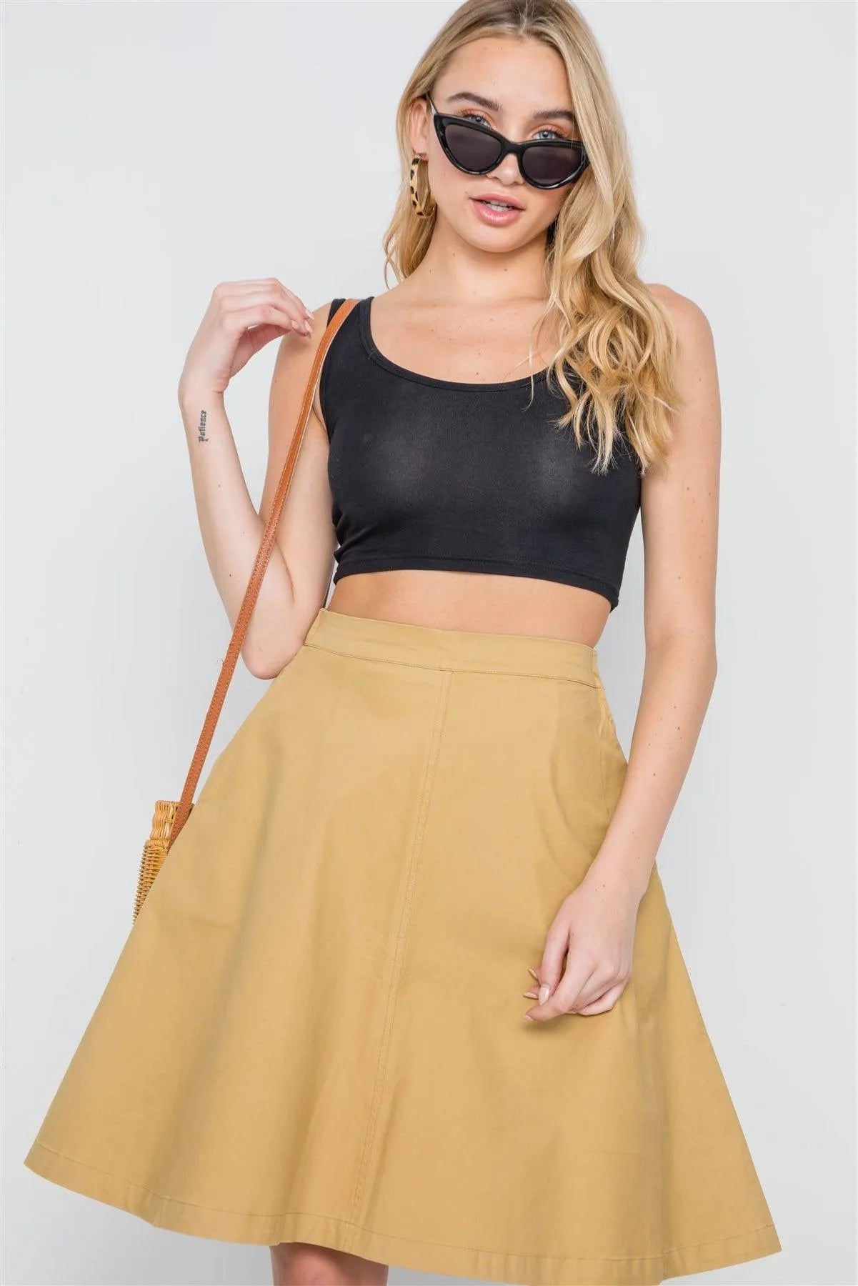 Khaki High Waist A-Line Solid Midi Skirt /2-2-1