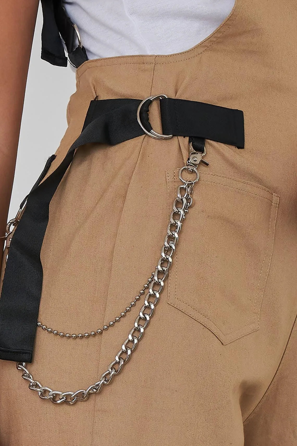 Khaki Print Zip Pocket Hardware Chained Cargo Overalls