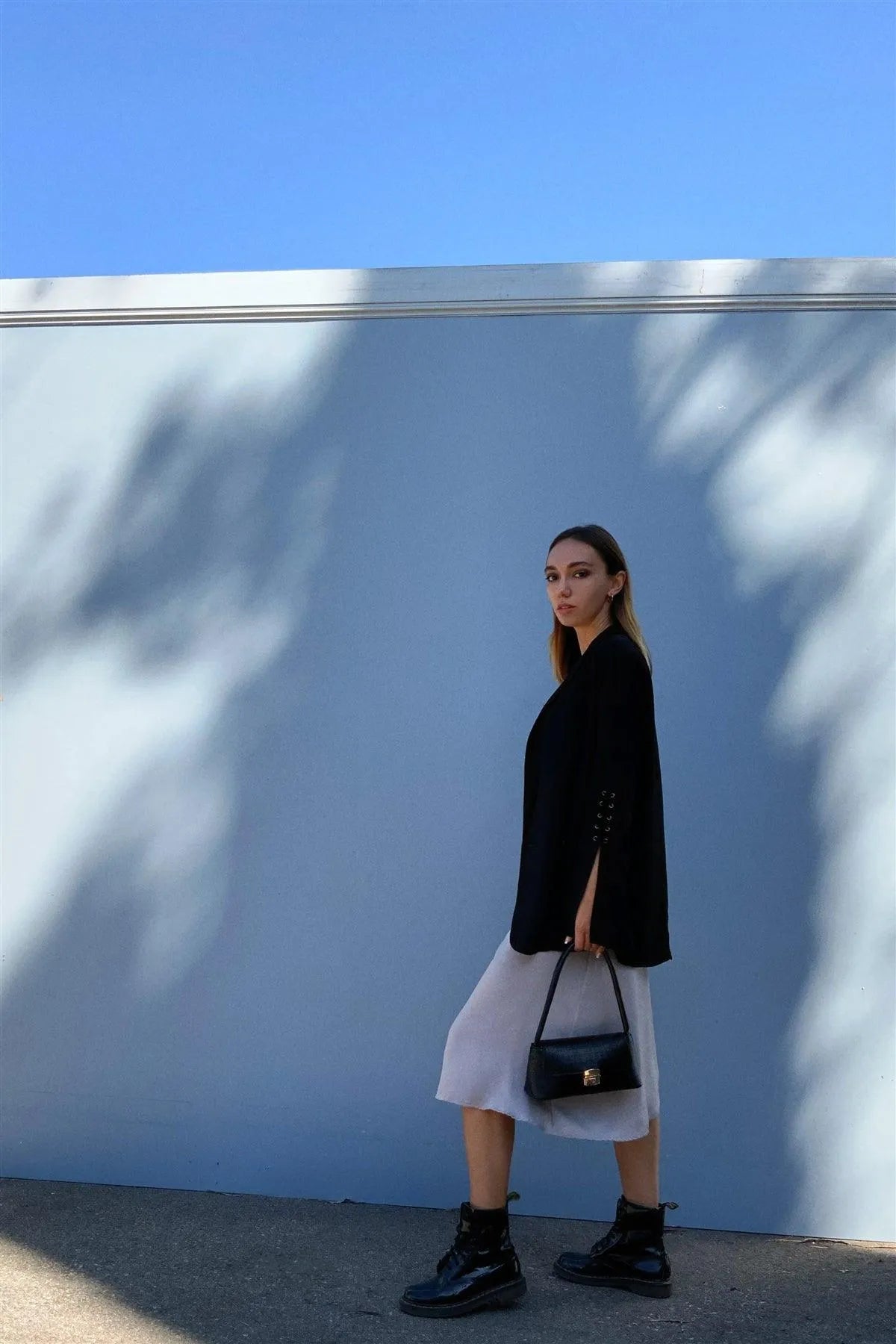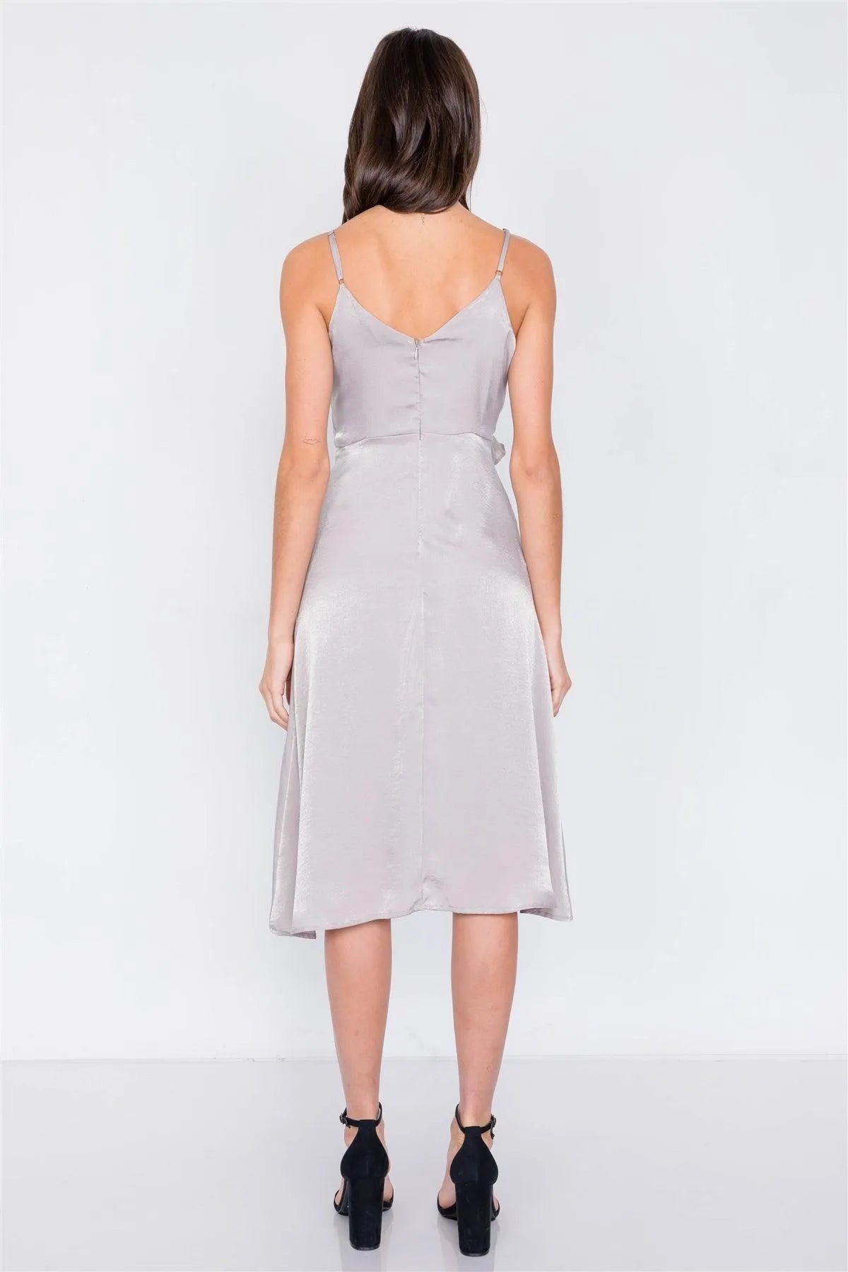 Dress features: flounce trim, v-neck, satin, midi length, solid, adjustable cami straps, chic, hidden back zipper closure, cocktail dress, a-line full skirt, lined, some stretch. Model is 5'9 wearing a size Small ( Waist: 23.5", Bust: 32B, Hips: 36")Top Measurements: Length: 44.5" , Bust: 33"True to SizeAlso available in Black and Red