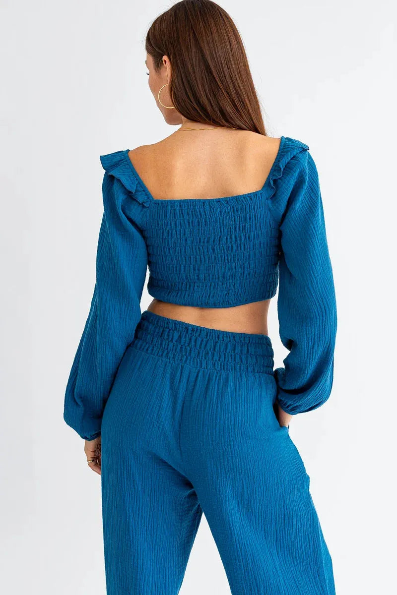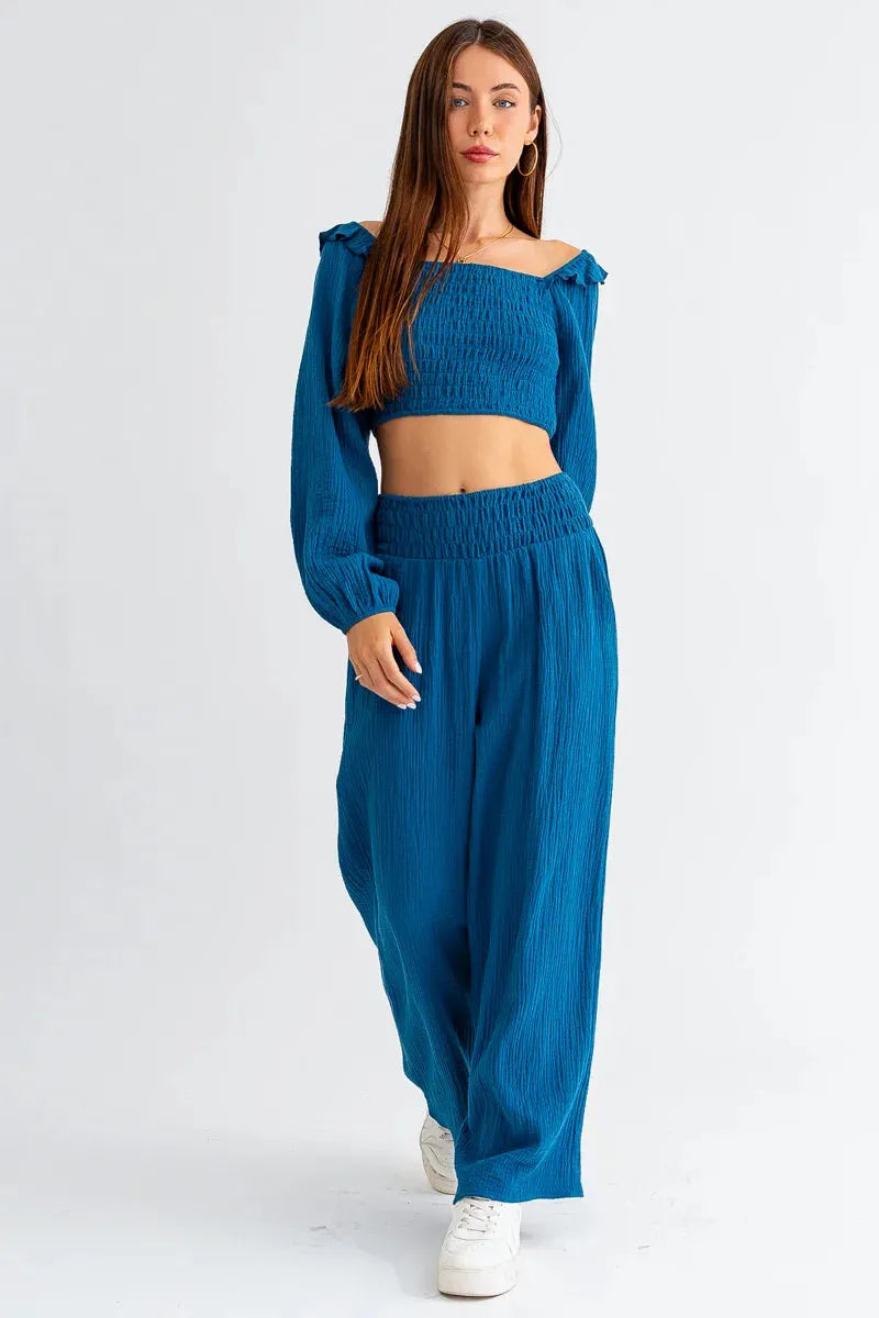 Cotton Smocked Long Sleeve Crop Top & Mid Waist Pants Set