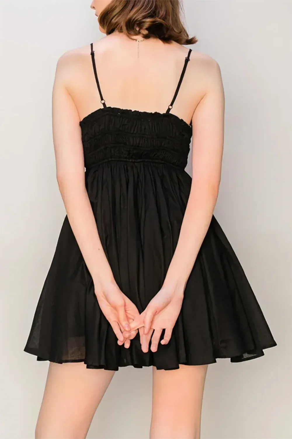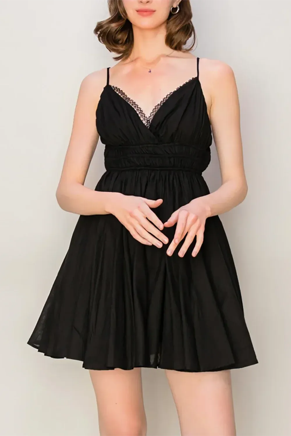🖤 Features: Lightweight flowy fabric, adjustable spaghetti straps, wrap-style v-neckline, delicate lace trim, smocked elastic waistband, full circle mini skirt, open back design, inner lining for modesty