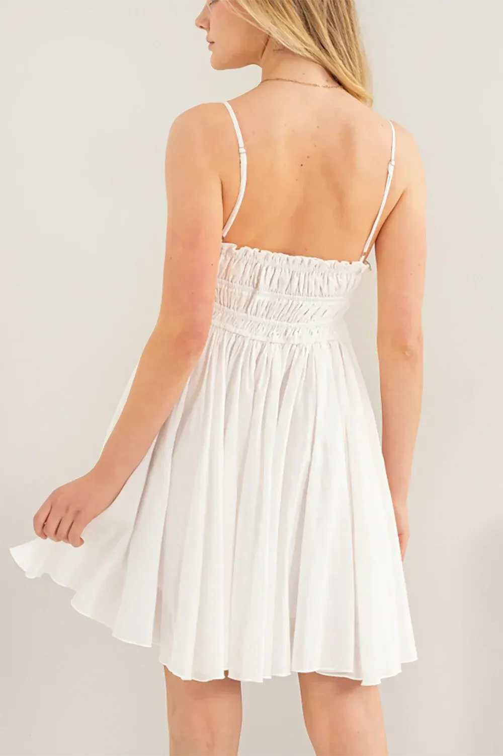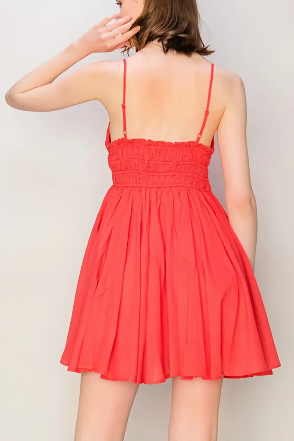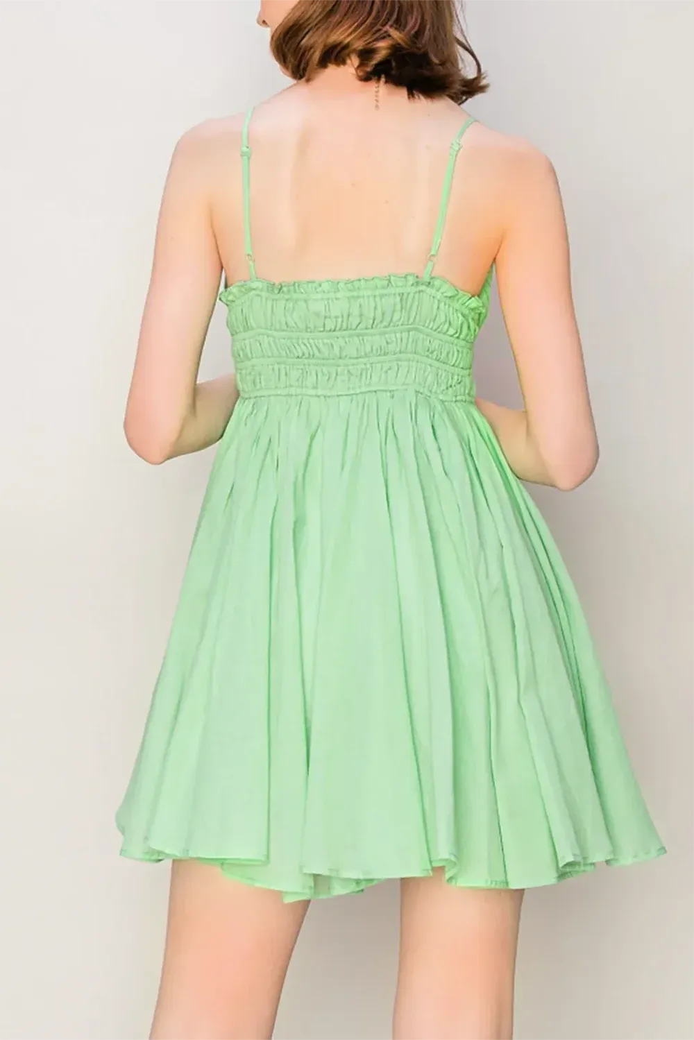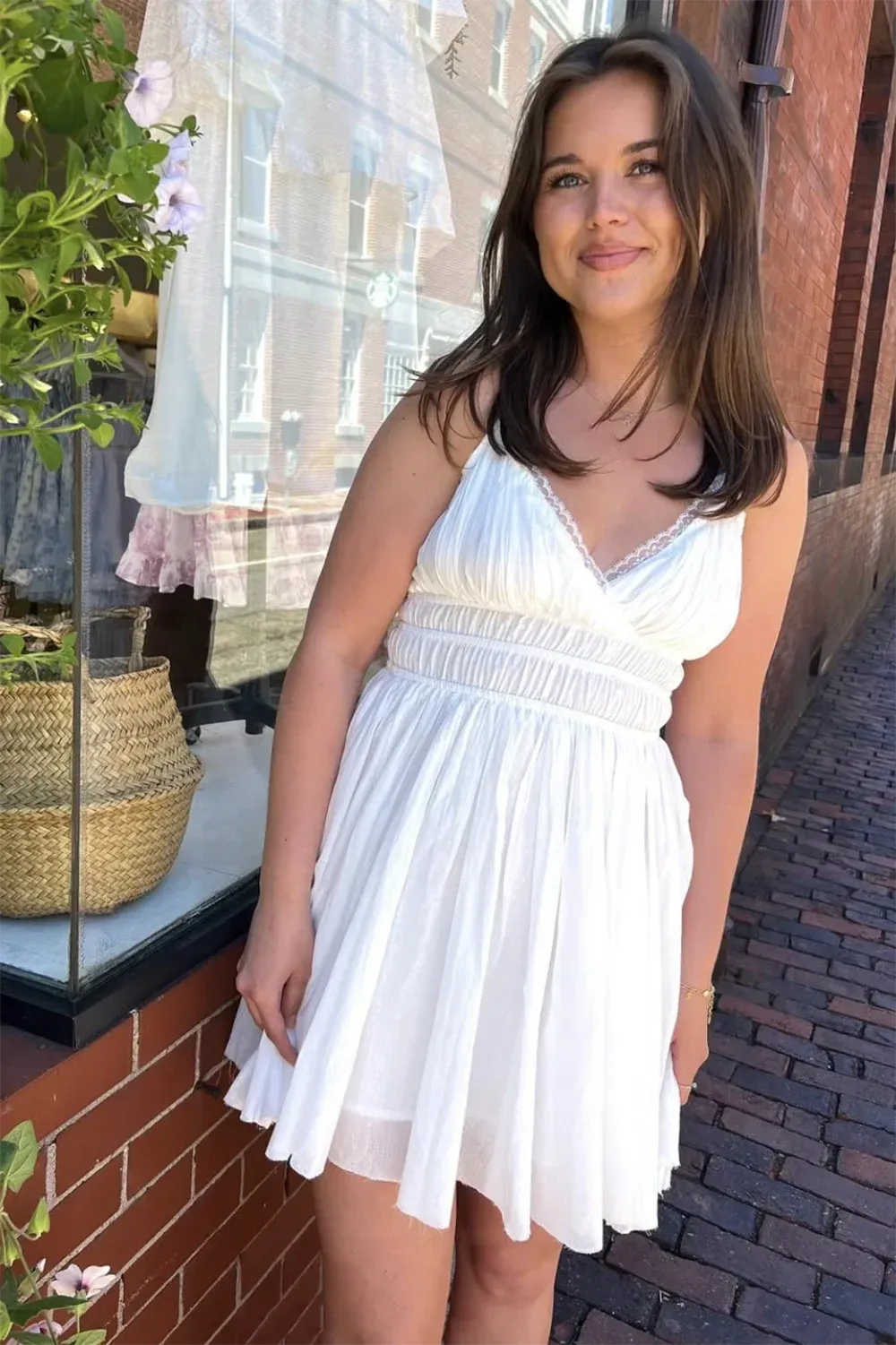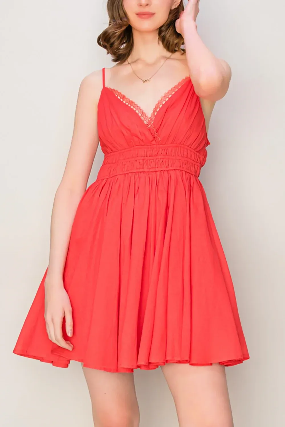 Bring playful elegance to your boutique with our romantic mini dress available in timeless black, pristine white, vibrant coral, and soft mint green. This feminine silhouette features a delicate lace-trimmed neckline, flattering wrap-style bodice, and a gathered smocked waist that creates the perfect balance of structure and flow. The full circle skirt adds beautiful movement with every step, making this an irresistible addition to your spring/summer collection.