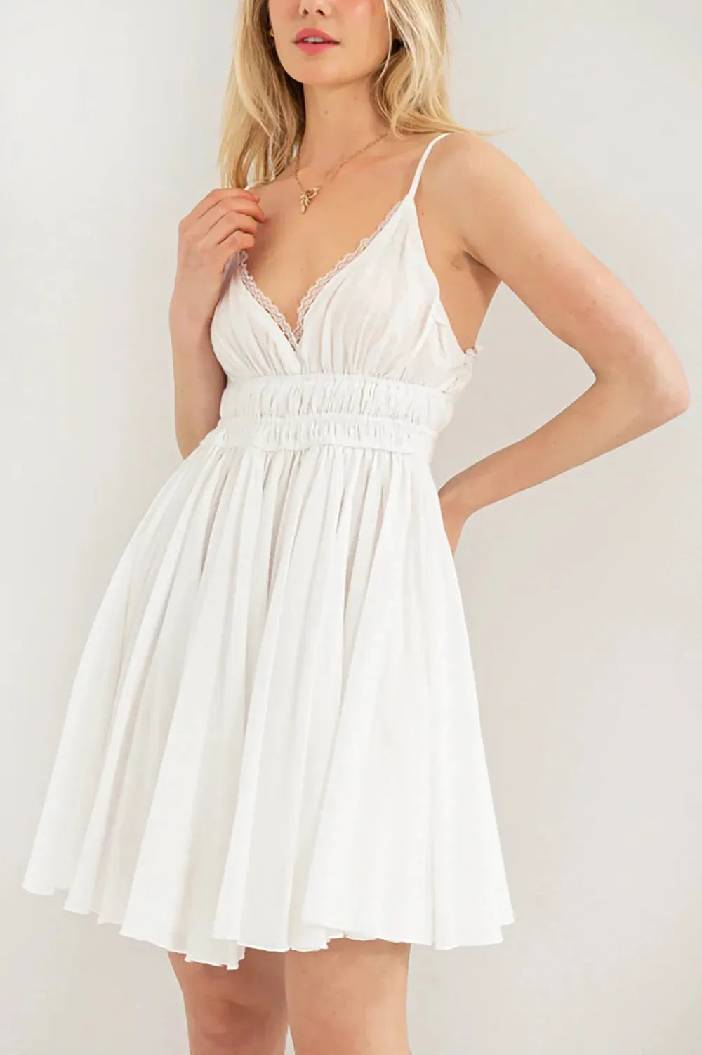 Romantic Lace-Trimmed Smocked Waist Wrap Front Mini Dress