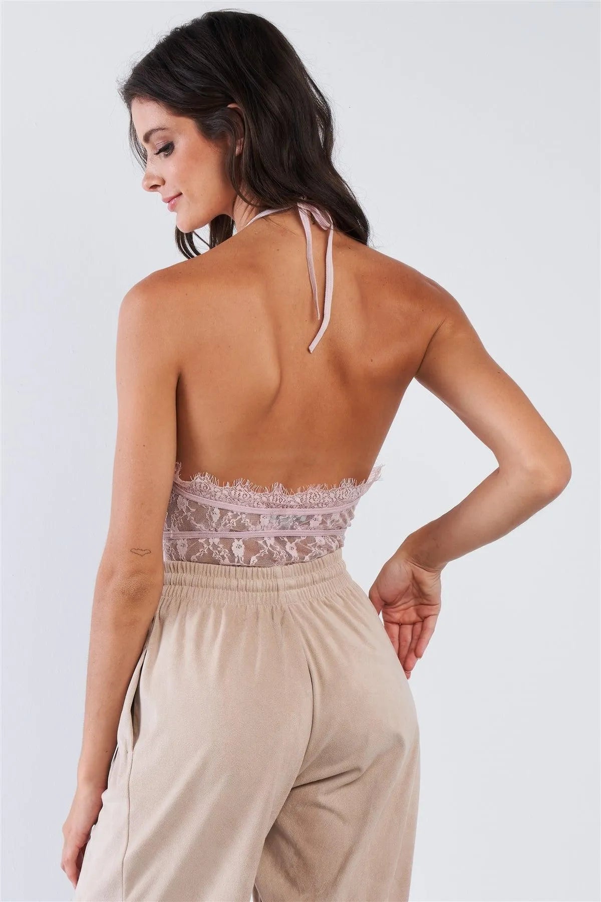 Lavender Floral Lace Stretchy Halter Tie Plunge V-Neck Bodysuit