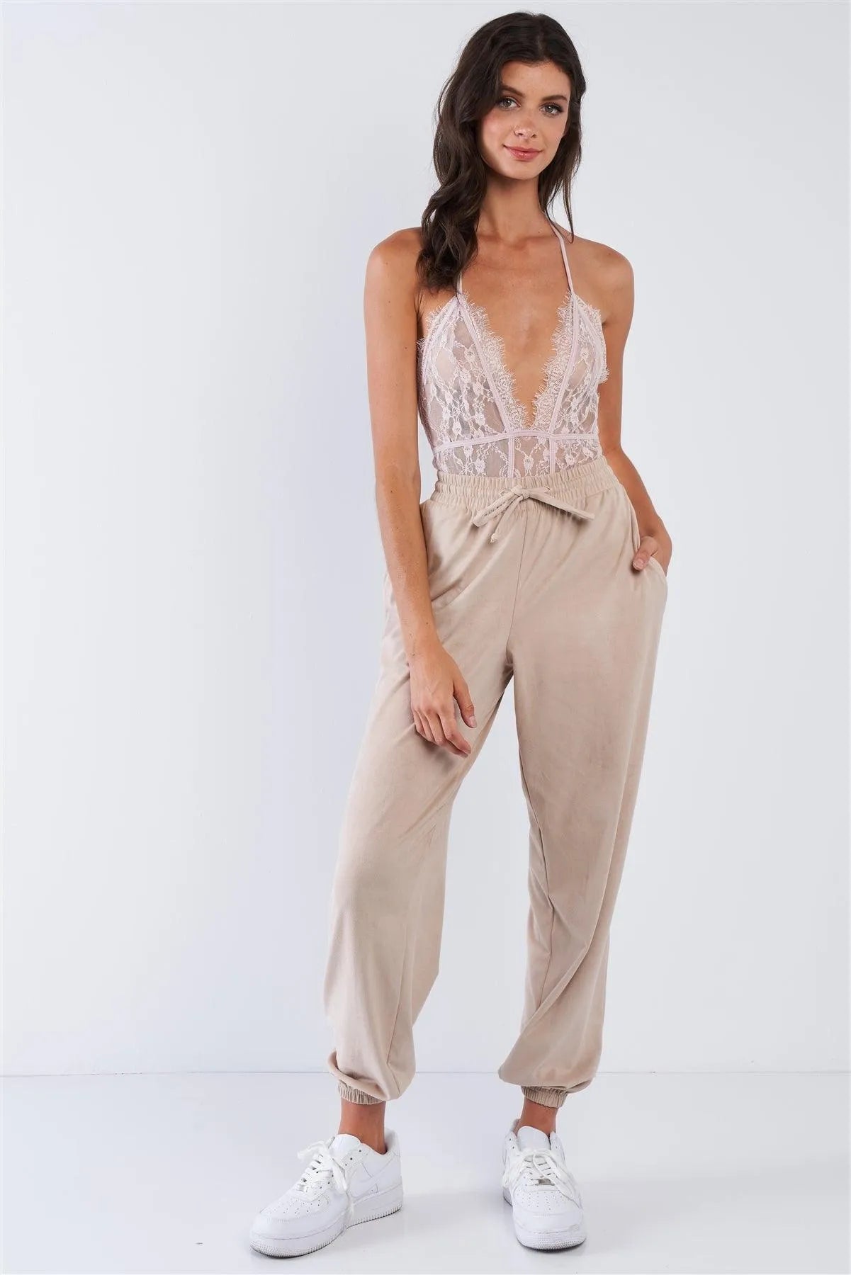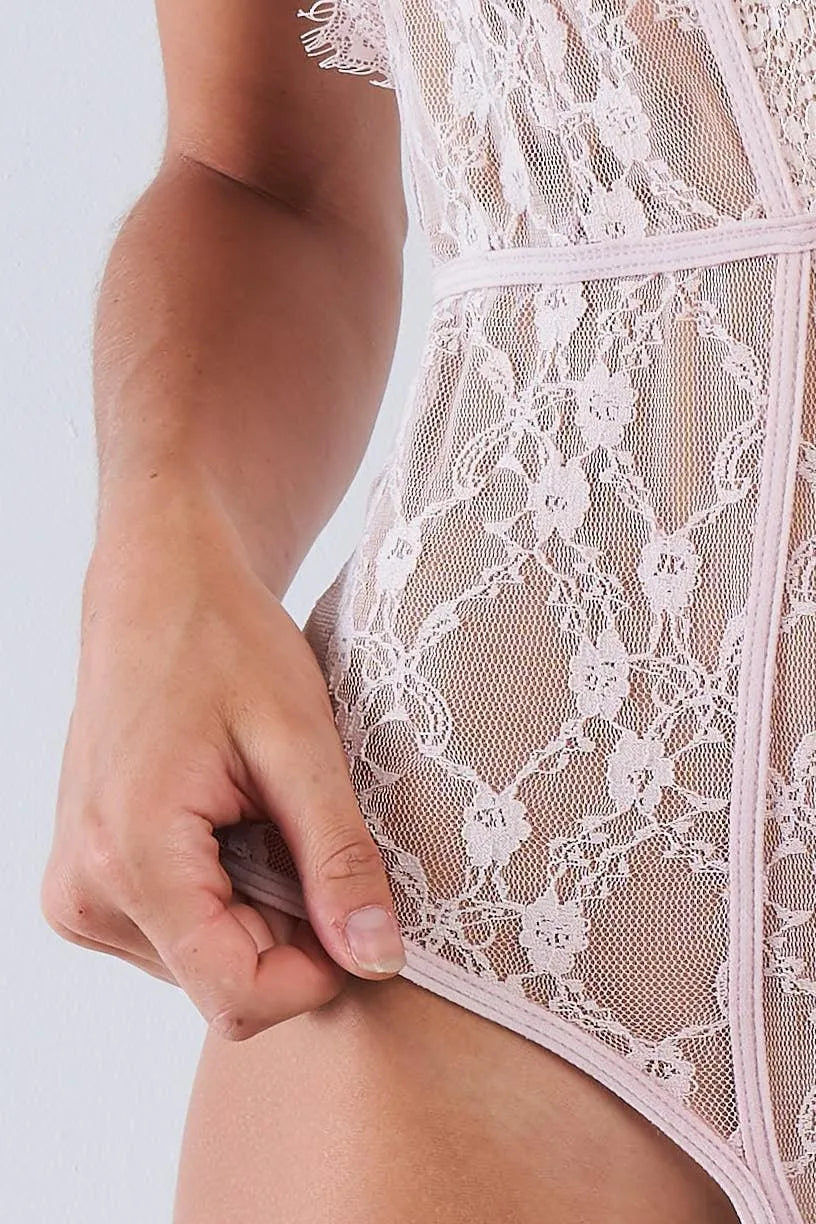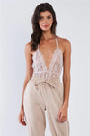 Lavender Floral Lace Stretchy Halter Tie Plunge V-Neck Bodysuit /2-2-2