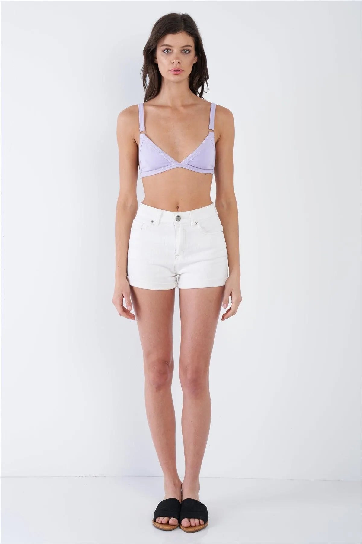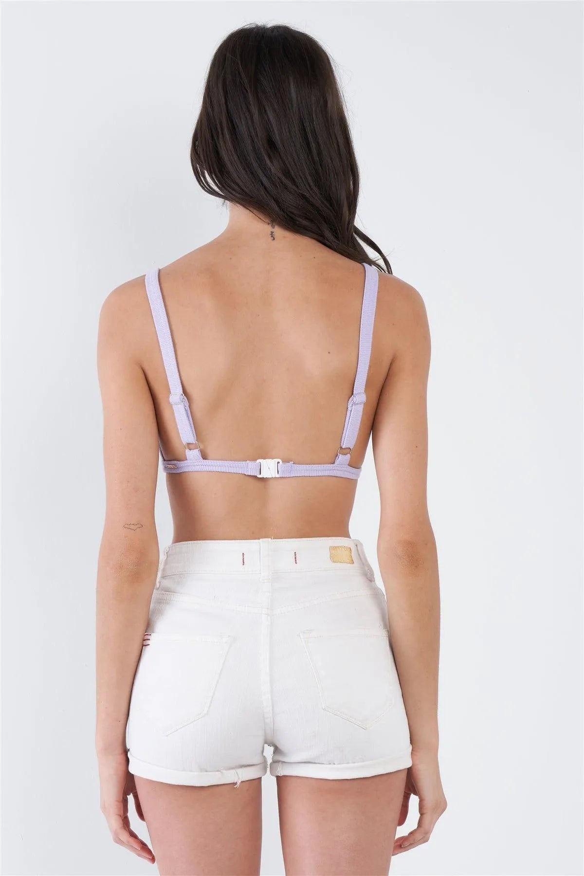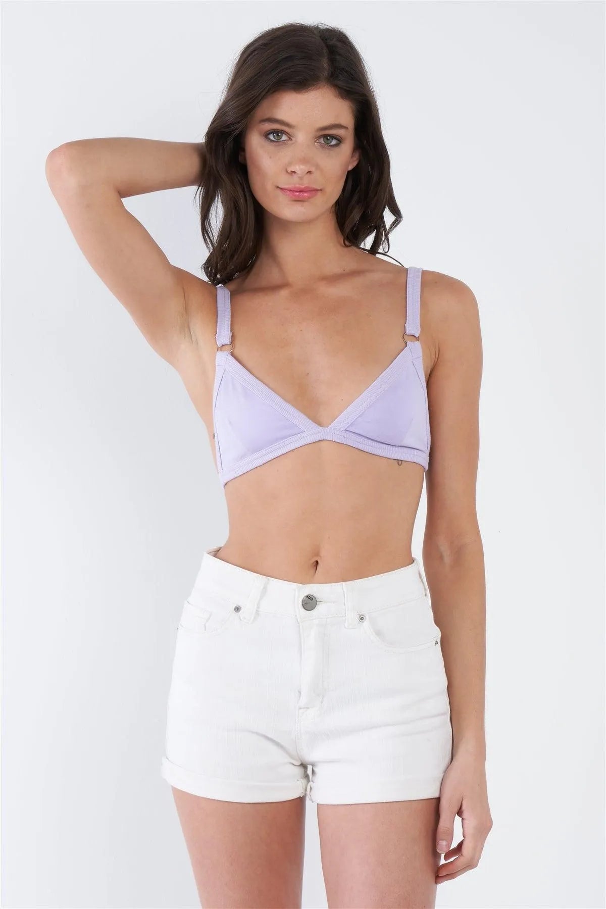 Bra Features: solid, powder lavender purple, silver hardware, v-neck, triangle cup, adjustable cami straps, causal, chic, unlined, stretchy.Model is 5'9 wearing a size Small ( Waist: 23.5", Bust: 32B, Hips: 36")Item Measurements: Length: 11" , Bust: 26"Item comes pre-packed with hang tagsTrue to sizeAlso available in Light Peach Pink