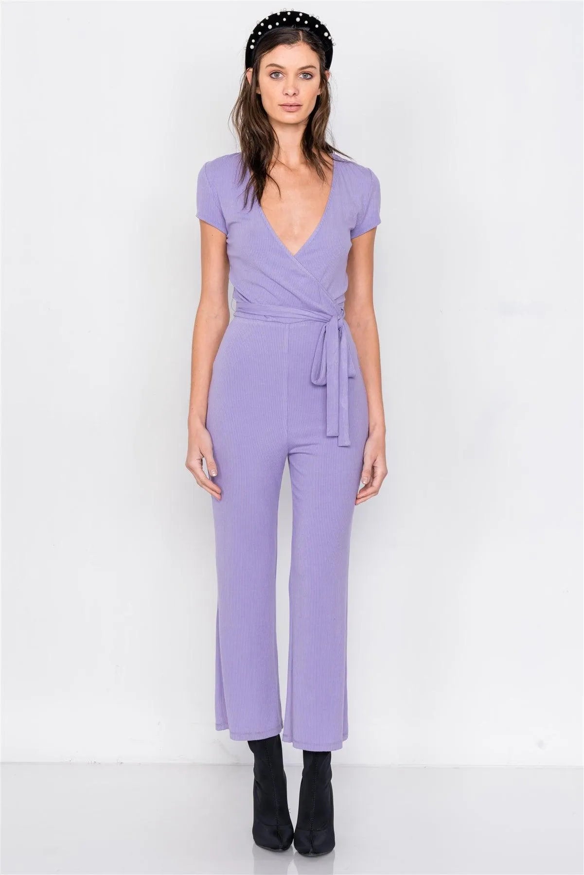 Lavender Purple Ribbed Casual Maxi V-Neck Jumpsuit