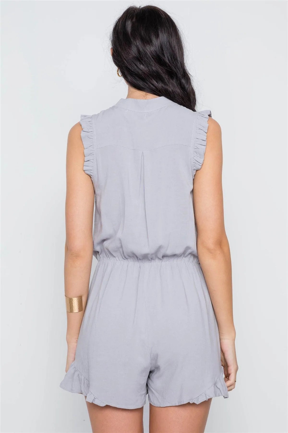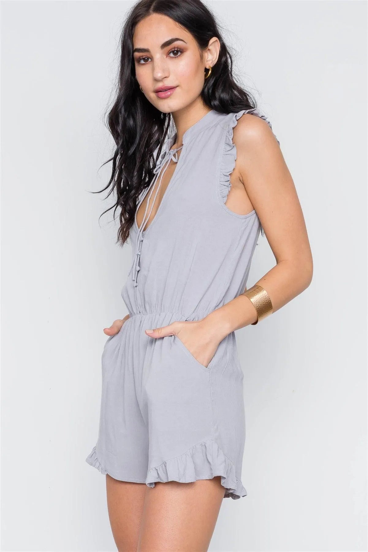Romper features: V-Neckline with self tie strings, button down closure, sleeveless with ruffle detailing along armhole and hem, elasticized at waist, side pockets, partly linedModel is 5'8 and wearing Small (Waist: 24", Bust: 32A, Hips: 34")Item Measurements: Length: 30", Bust: 34"True to size