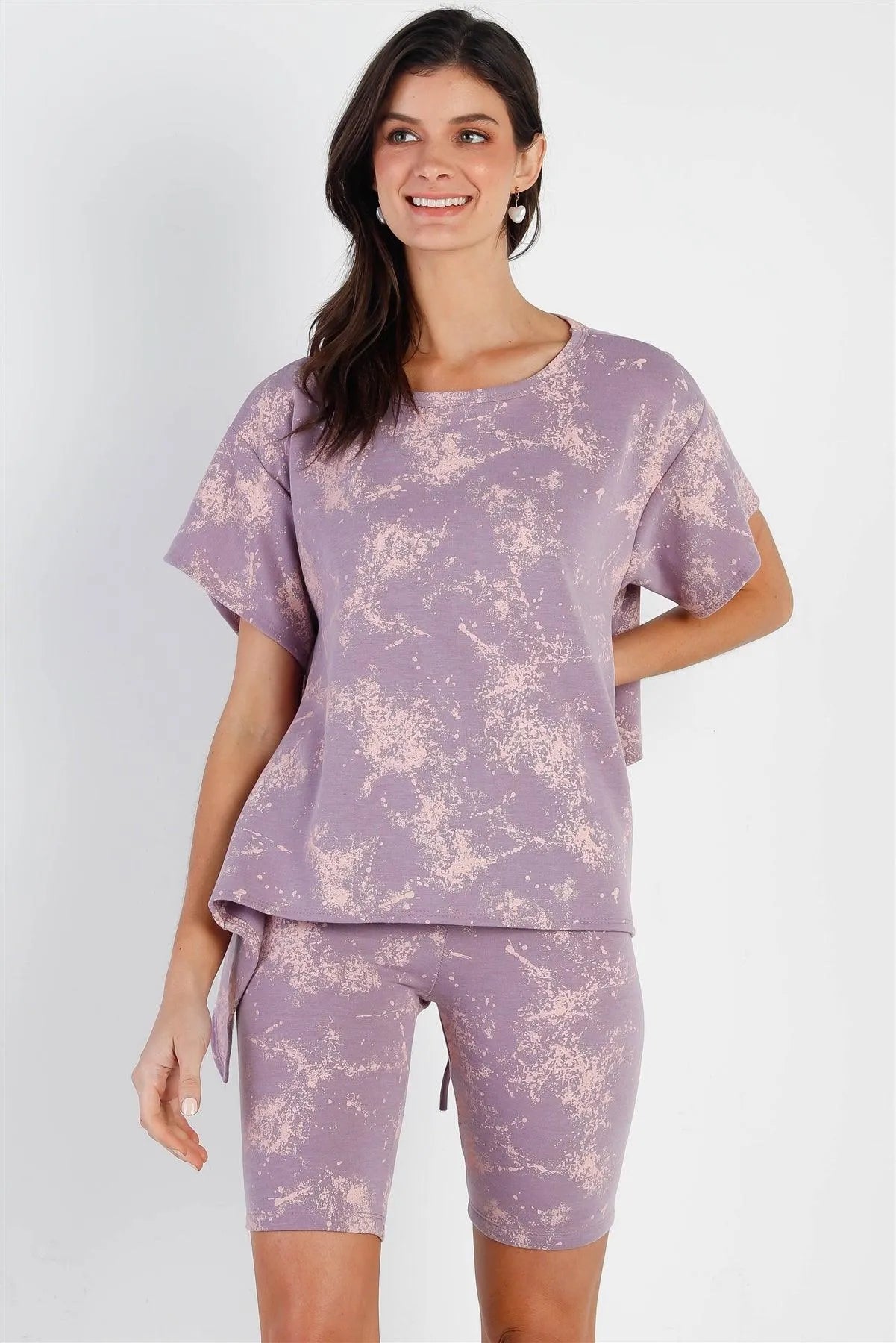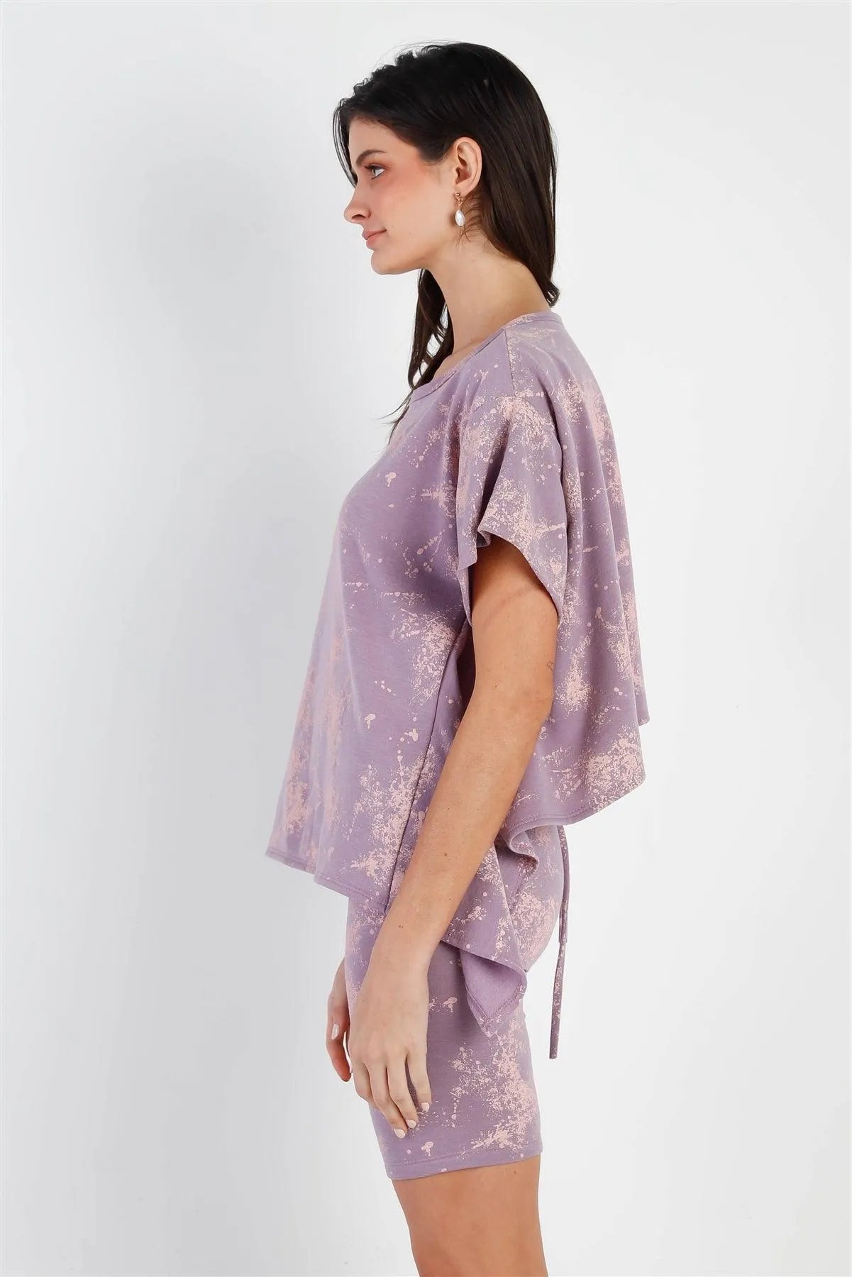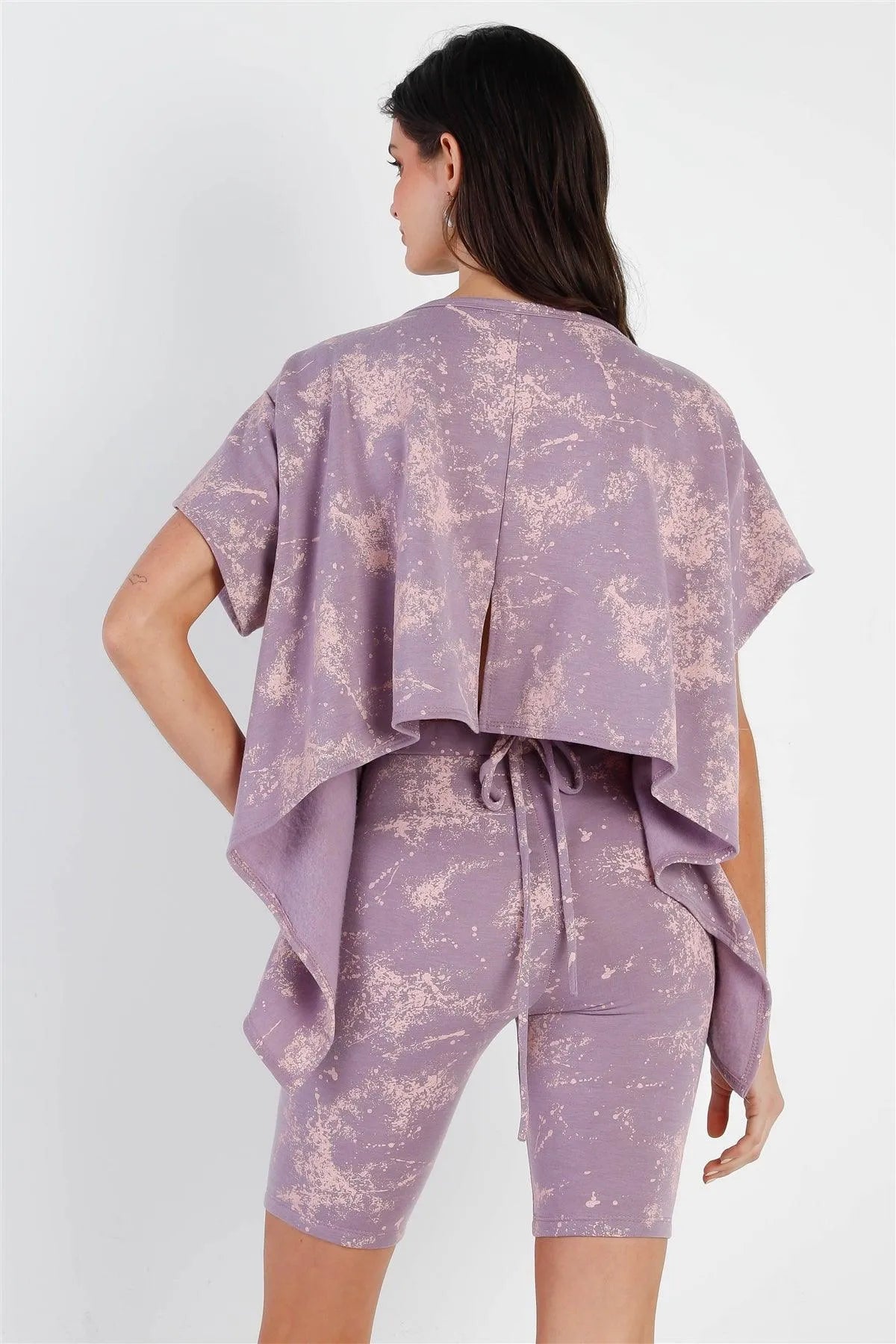 Lavender Splattered Paint Fleece Uneven Length Back Tie Detail Top & Biker Short Set /2-2-2