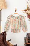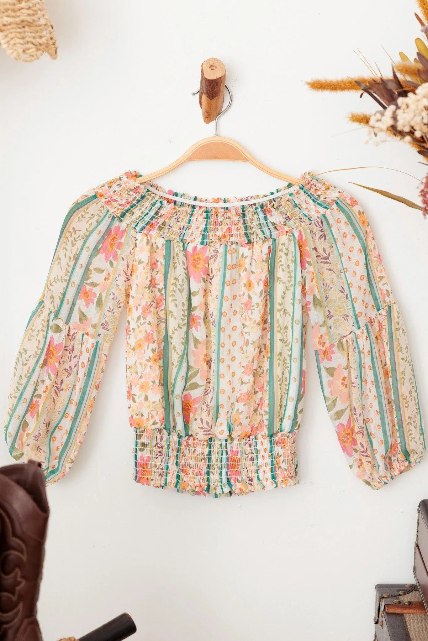 Girls Western Floral Sheer Puff Sleeve Ruched Hem Top