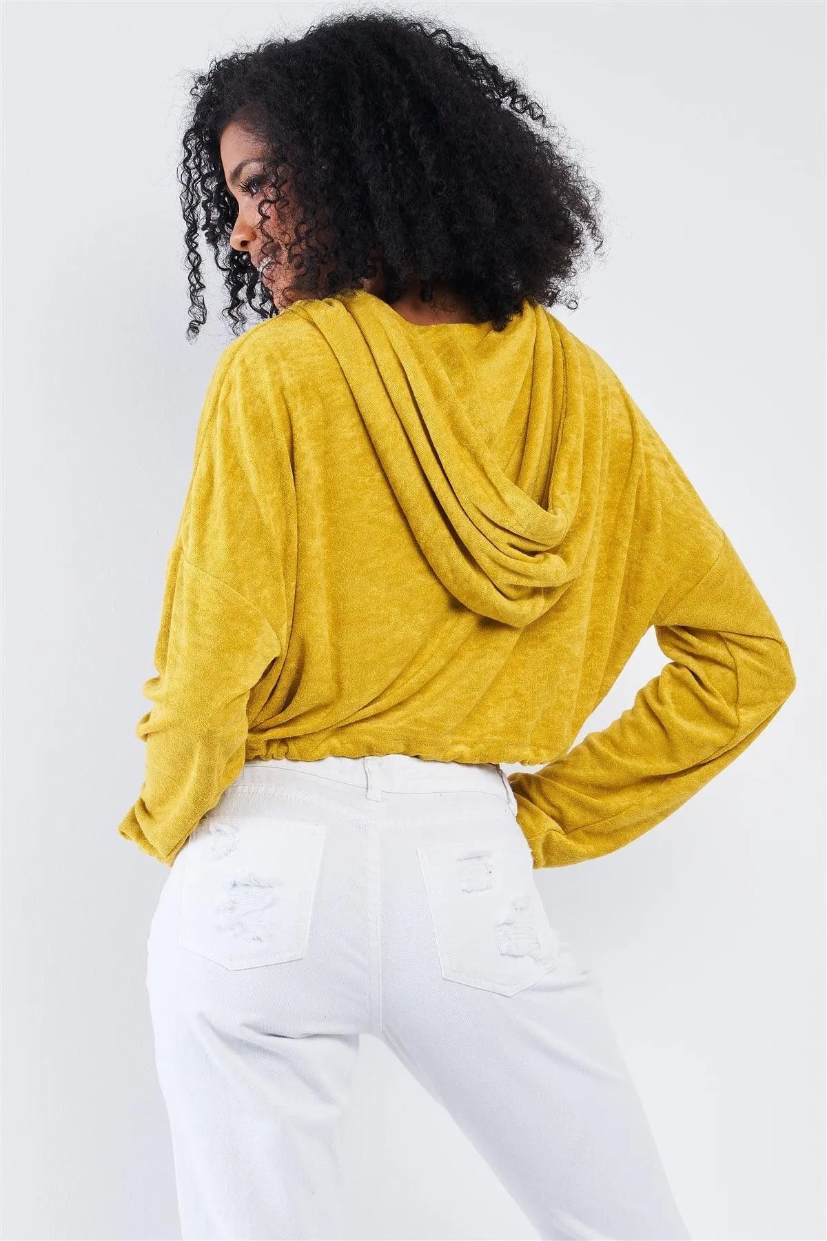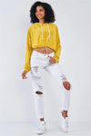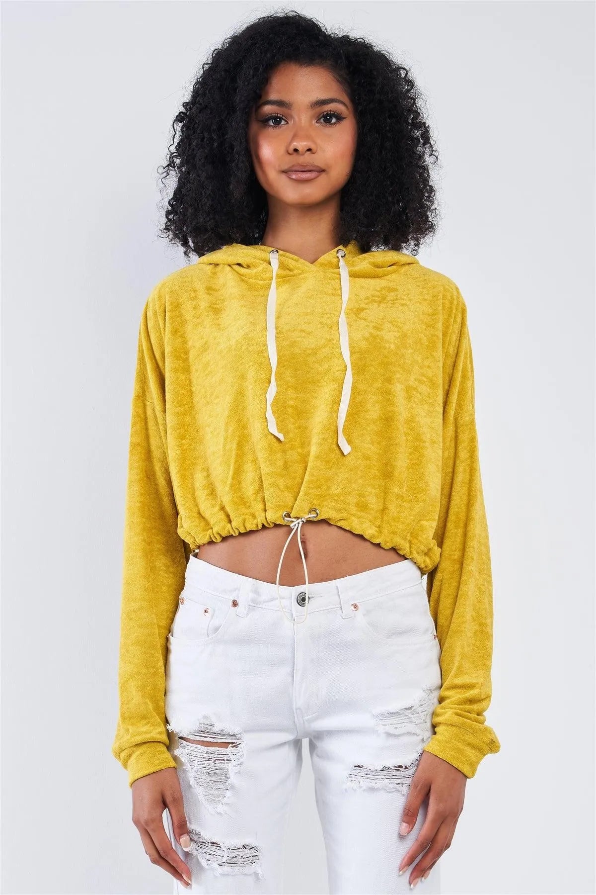 Lemon Yellow Soft Relaxed Fit Long Sleeve Elastic Loop Draw String Tie Cropped Hoodie /3-2-1