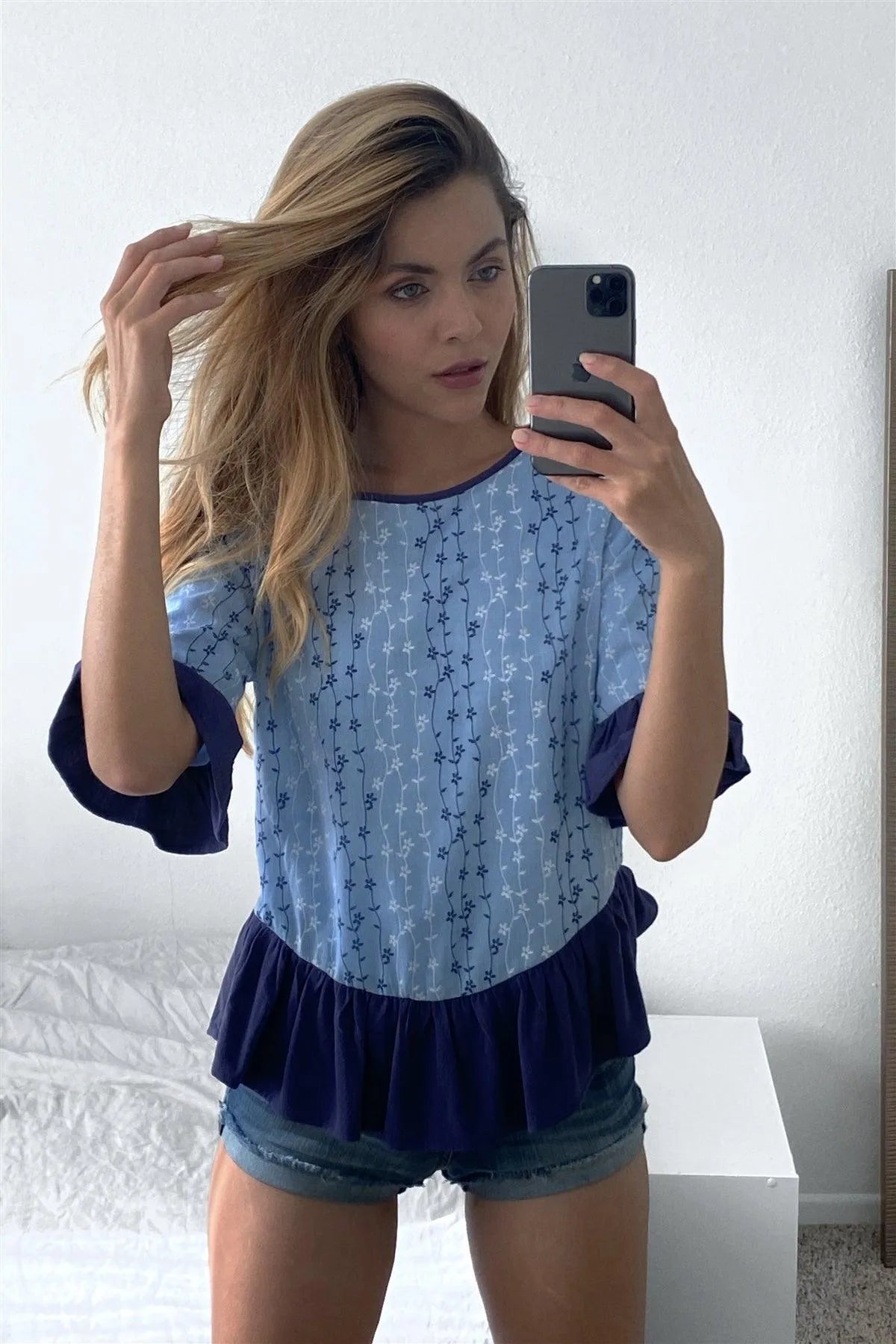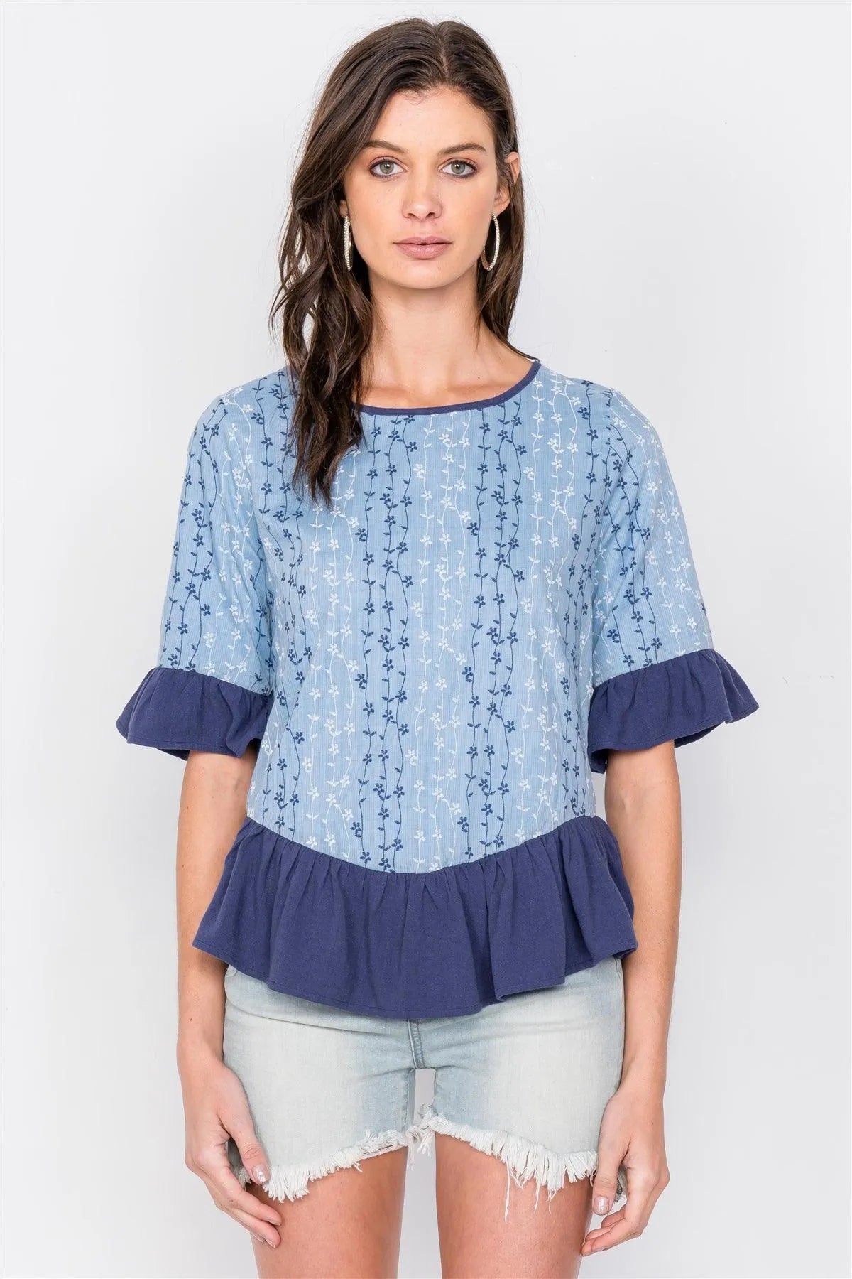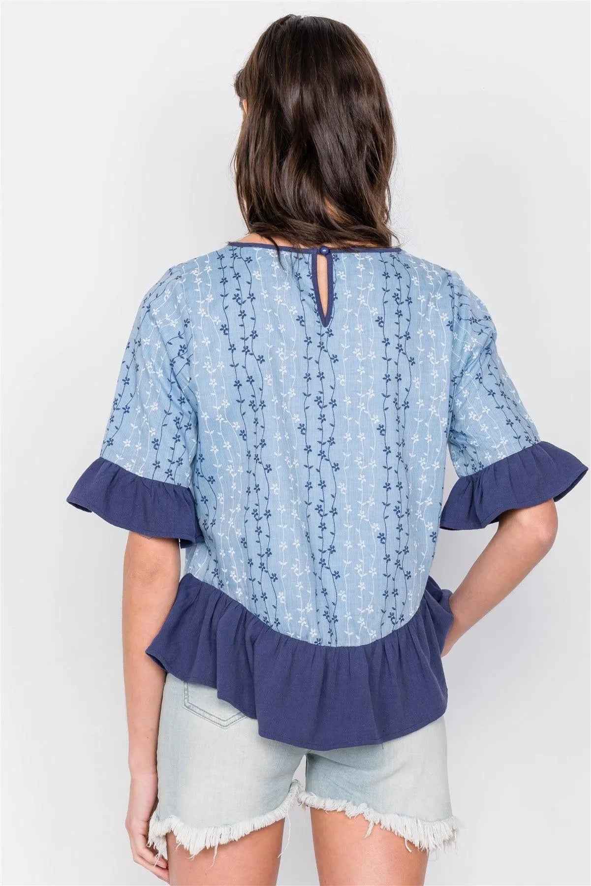 Light Blue Cotton Boho Chic Floral Flounce Trim Peplum Top /2-2-2