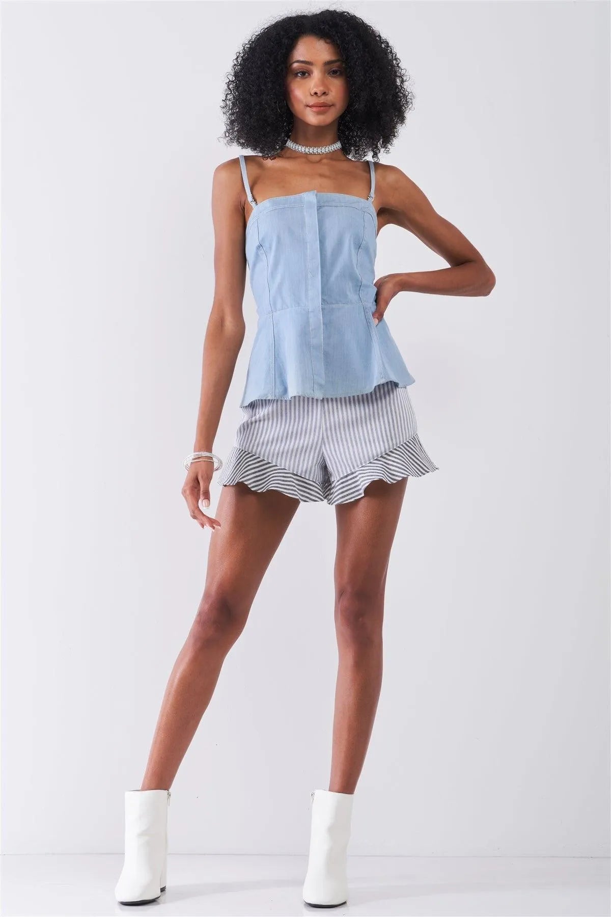 🖤 Item features: Light blue, denim, visible stitching, sleeveless, detachable adjustable tightness shoulder straps, square neckline, button-down front, smock back detail, fitted waistline, fit & flare cut, unlined, semi-stretch, regular fit, casual, cute, comfy, stylish, minimalistic, elegant, spring/summer collection