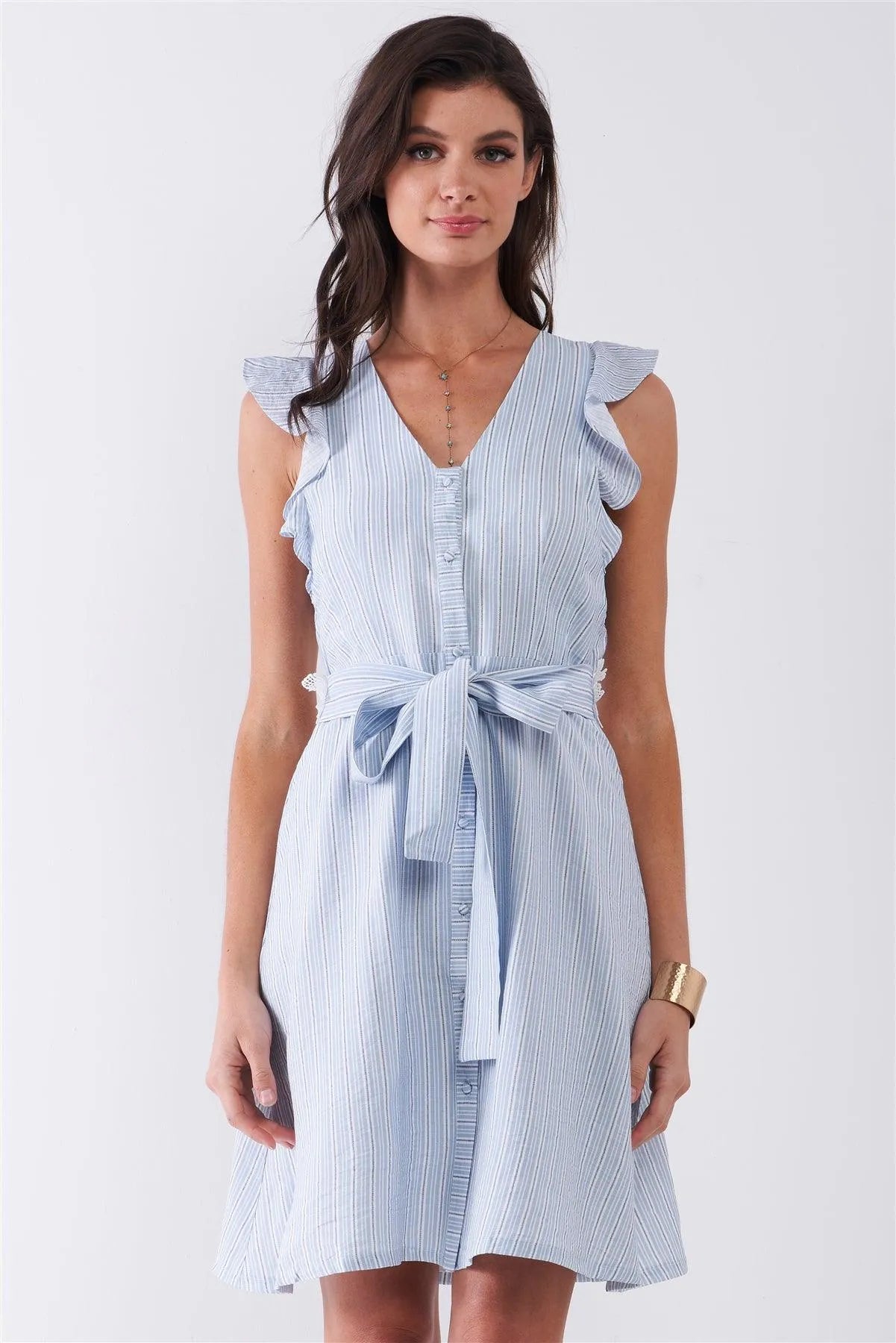 French Riviera Light Blue Striped Sleeveless Ruffle Floral Lace Trim Detail Self-Tie Waist Mini Dress