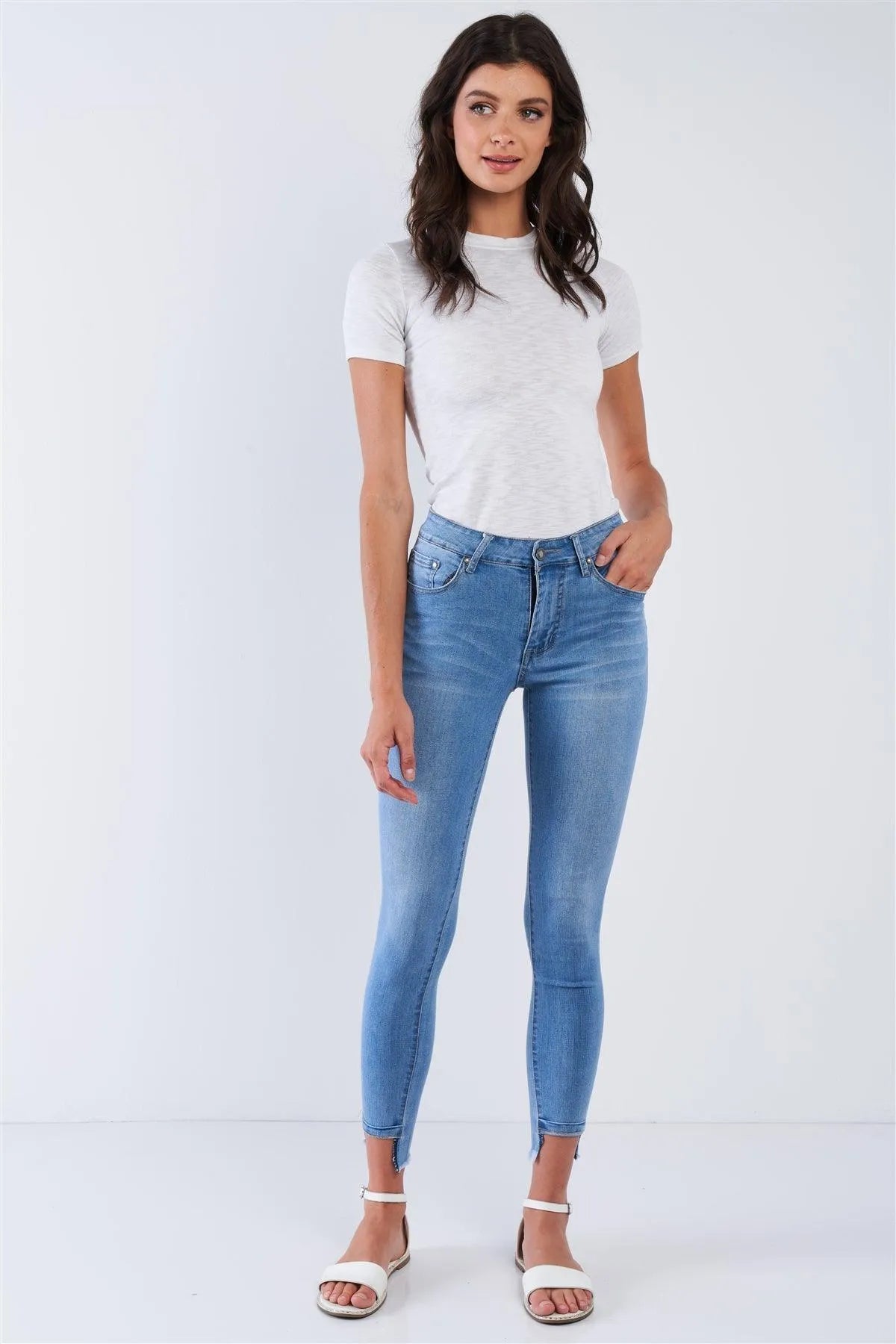 Pant Features: Light blue wash, high waisted, front pockets, back pockets, hidden crotch zipper, metal button closure, belt loops, stretchy, ankle length, tight fitModel is 5'9 wearing a size Small ( Waist: 23.5", Bust: 32B, Hips: 36")Item Measurements: Length: 37", Waist: 26"Item comes pre-packed True to size