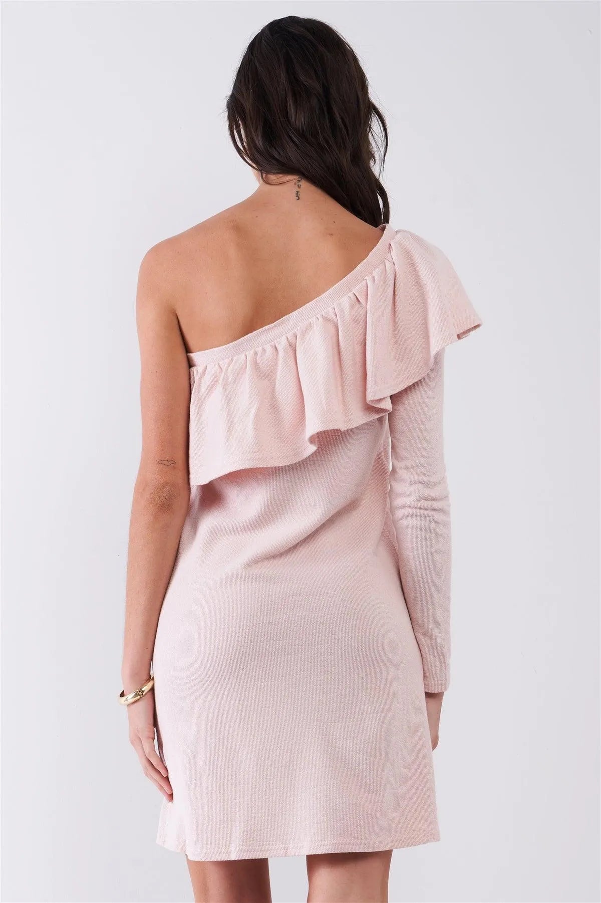 Light Blush Ribbed One-Sleeve Ruffle Trim Detail Loose Fit Mini Dress /1-2-3-1
