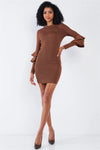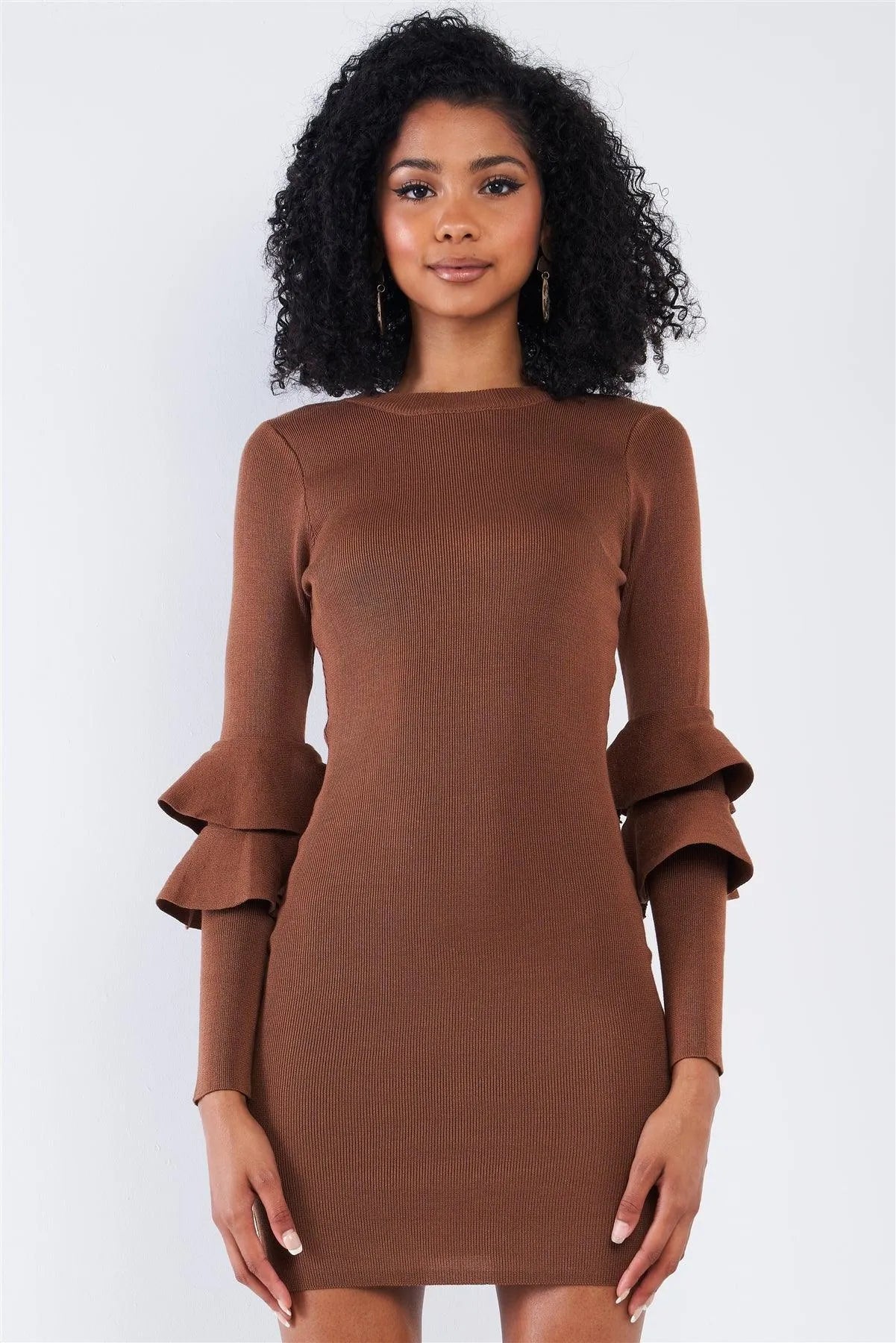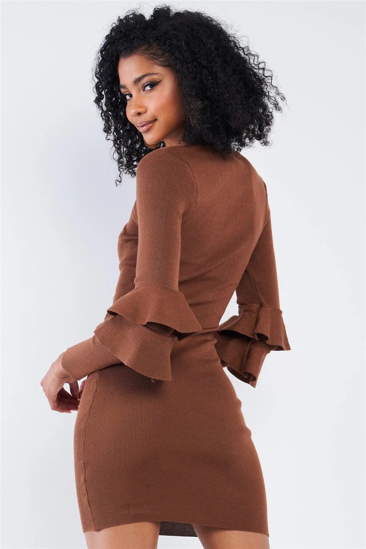 Light Coffee Brown Body-Con Tight Fit Round Neck Double Frill Sleeve Mini Dress
