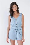 Light Denim Blue Cotton V-Neck Front Button Short Romper /2-1-1