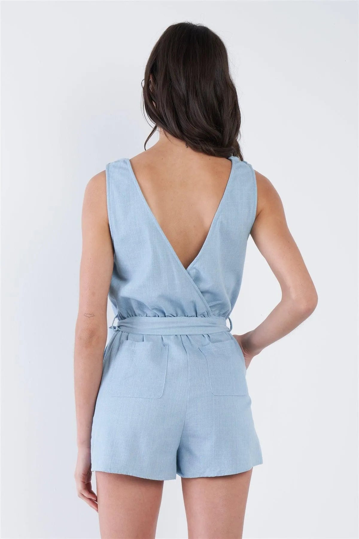 Light Denim Blue Cotton V-Neck Front Button Short Romper /2-2-2