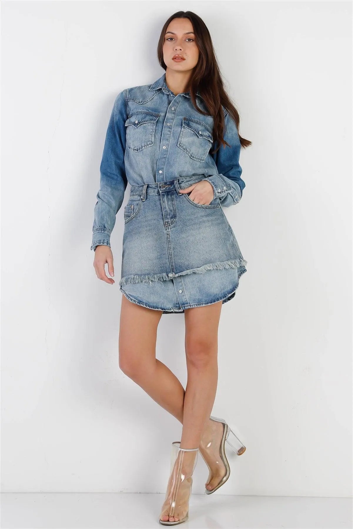 Light Denim Cotton Button Up Long Shirt & Mini Skirt Set /2-1-2