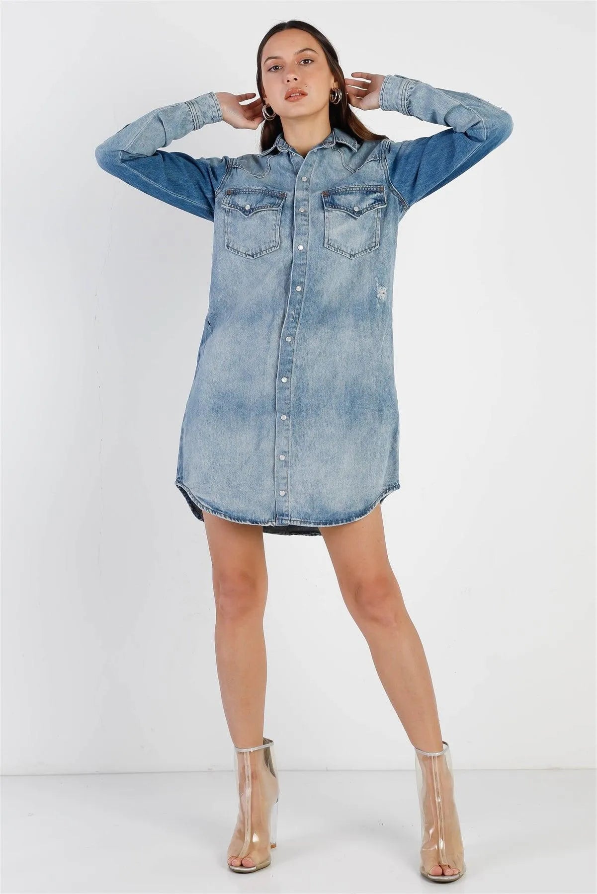 🖤 Item features: Light denim, cotton material, distressed effect, snap button up closure shirt, long cuffed sleeves with snap button closure, collared, two front pockets, long, relaxed fit, waist button loops to attach skirt, mini length skirt, zip up & button front closure, raw hem, three front & two back pockets, asymmetrical trim, belt loops, side waistline